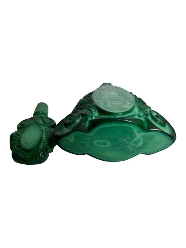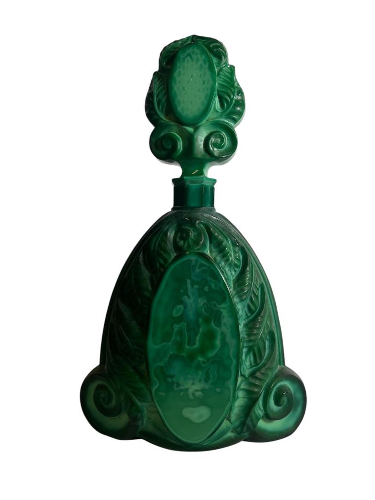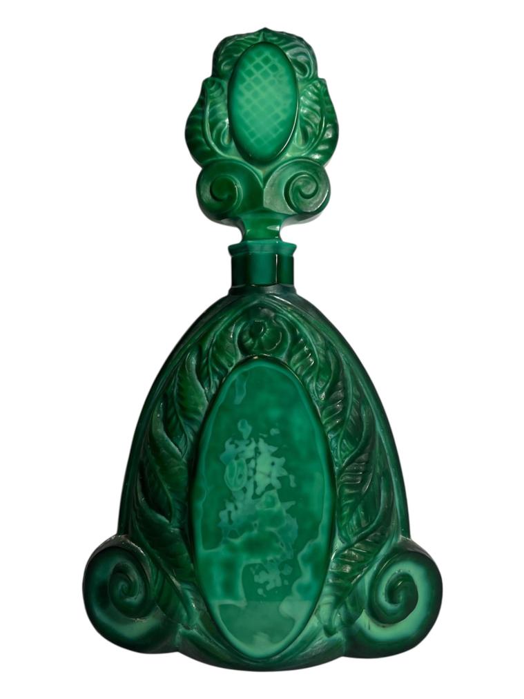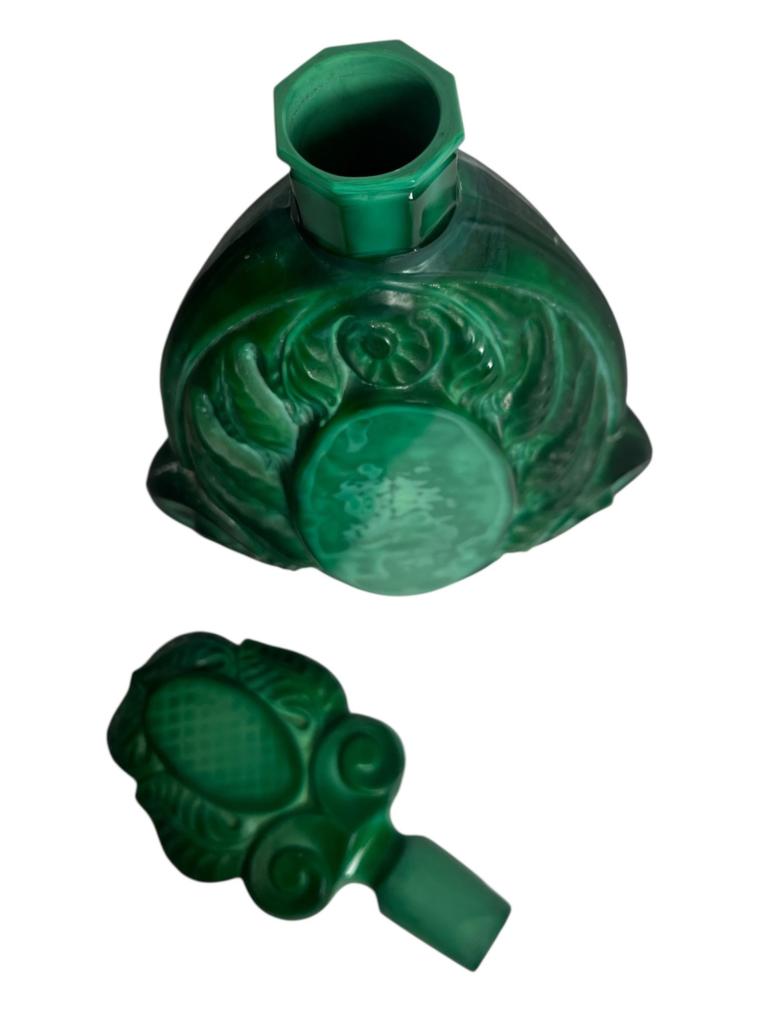 Krásná zdobná karafa z malachitového skla, autor Curt Schlevogt. Na matné karafě jsou vybroušené lesklé plošky se zajímavou kresbou, zbytek je tvořen organickými florálními tvary, které se kroutí, okraje ploch lemují listy. Výška 29,5 cm, v nejširším bodě 18,5 cm, podstava 14,5 x 7 cm, průměr hrdla 3,5 cm, celková výška zátky 13,5 cm, v nejširším bodě 8 cm. Zátka má po hranách jemné oťuky, jinak skvělý stav.
