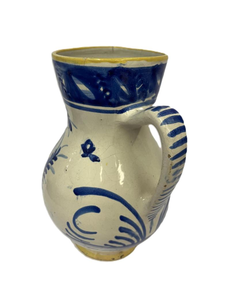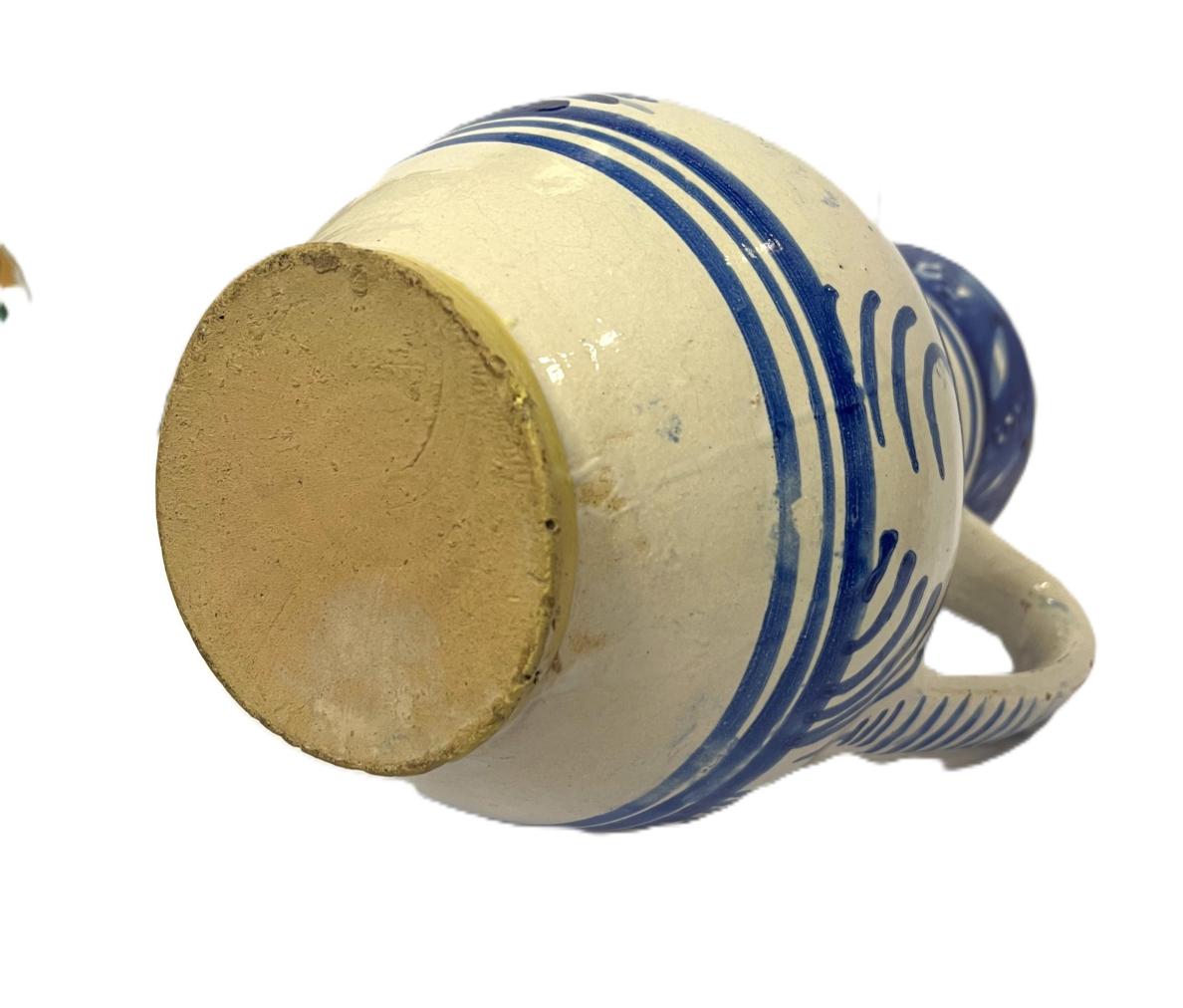 Krásný starožitný keramický džbán z 19. století s vyobrazením madony. Ikonu rámují klasy obilí a linka kolem, modré linky a zdobení najdeme po celém džbánu, okraje lemuje žlutá barva. Výška 23 cm, průměr hrdla 10,5 cm, podstava 8,5 cm. Na podstavě je několik větších oťuků, na hraně hrdla také viz foto, ucho džbánu také menší oťuky, z vnější strany džbánu jedna výrazná prasklina.