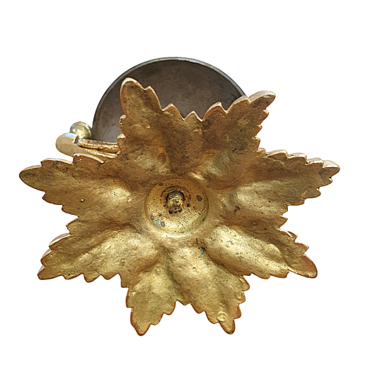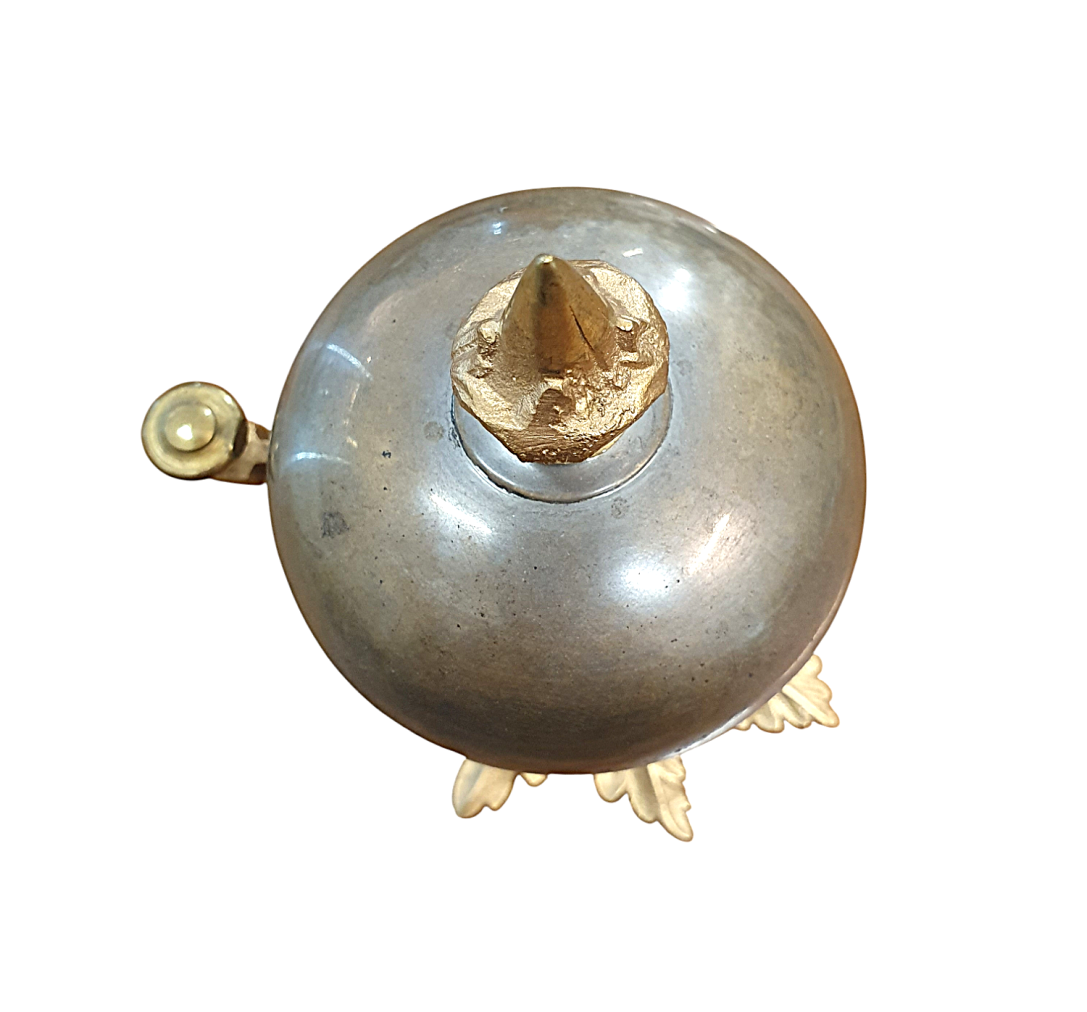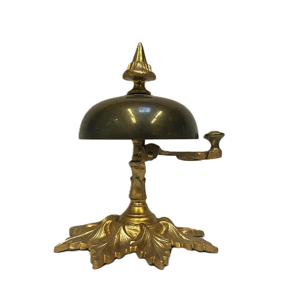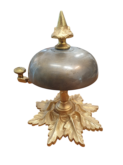 Krásný kovový zvonek na nožičce se zlaceným dekorem ve formě listů. Výška 12 cm, průměr podstavy 9 cm, průměr zvonku 7 cm. Velice hlasitý a mohutný tón.
