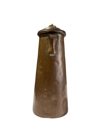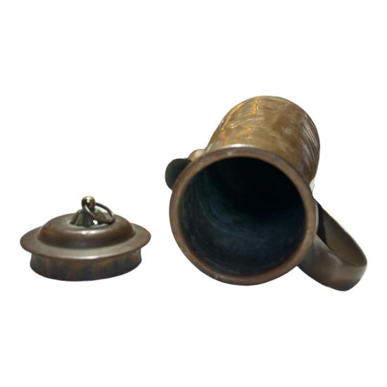 Stará mosazná konvice s deklíkem. Celková výška i s očkem na uzávěru je 32 cm. Vnitřní průměr hrdla je 8 cm. 13 cm. Průměr podstavy je 12,5 cm. V nejširším bodě i s uchem měří 16 cm .Konvice je na několika místech promáčknutá nebo lehce deformovaná, víčko je vyplněno těžkým materiálem. Stav odpovídá stáří, neznačeno.