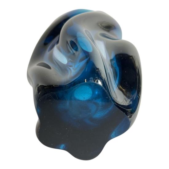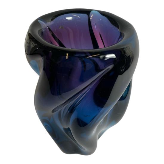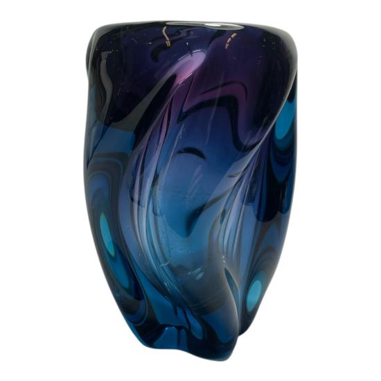 Hutní váza v sytých barvách tmavě fialové a modré. Na výšku měří 18 cm. Vnitřní průměr hrdla je 7 cm, vnější 10. Průměr podstavy je 7 cm. Autorem je výtvarník Josef Hospodka, sklárna Chřibská. Podstava je lehce ošoupaná. Jinak v dobrém stavu. Neznačeno.