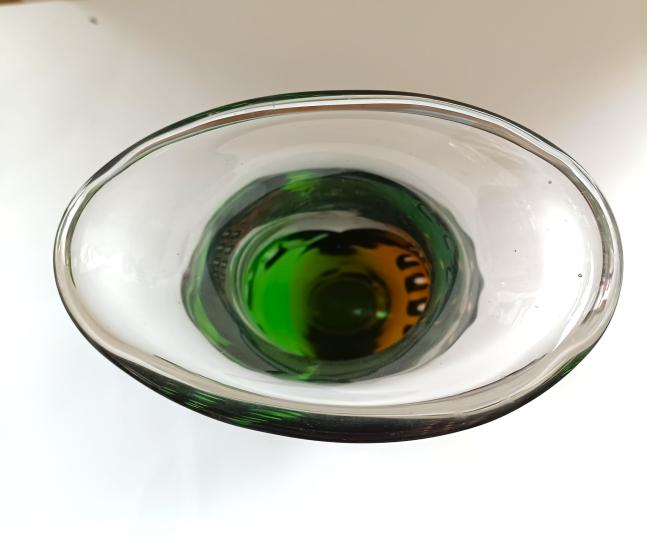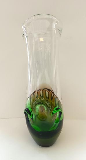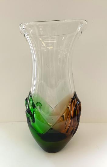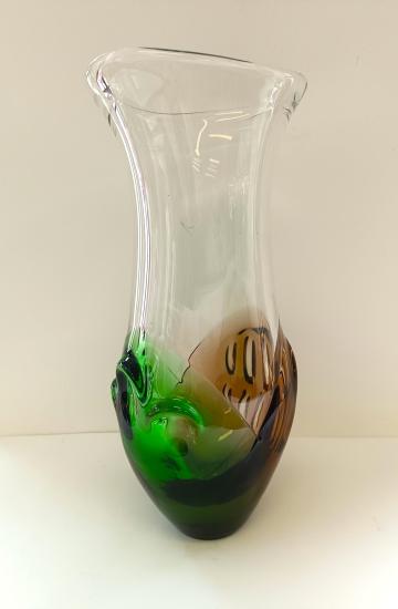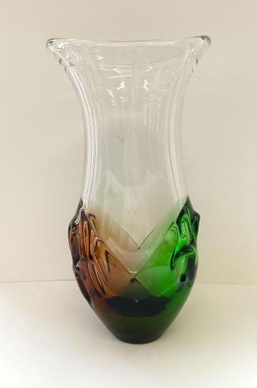 Váza z čirého hutního skla, zdobenaá tvarovanými hnědými a zelenými vrstvami po stranách. Tuto vázu navrhl autor Ladislav Paleček pro sklárnu Škrdlovice. Rozměry: 28 x 13cm, průměr hrdla: 14 x 9,5cm, na podstavci o průměru 5,5cm. Váza je lehce poškrábaná, jinak bez vady.