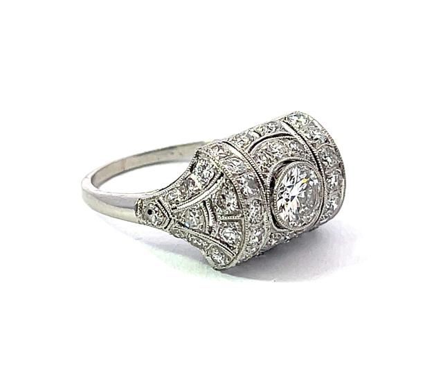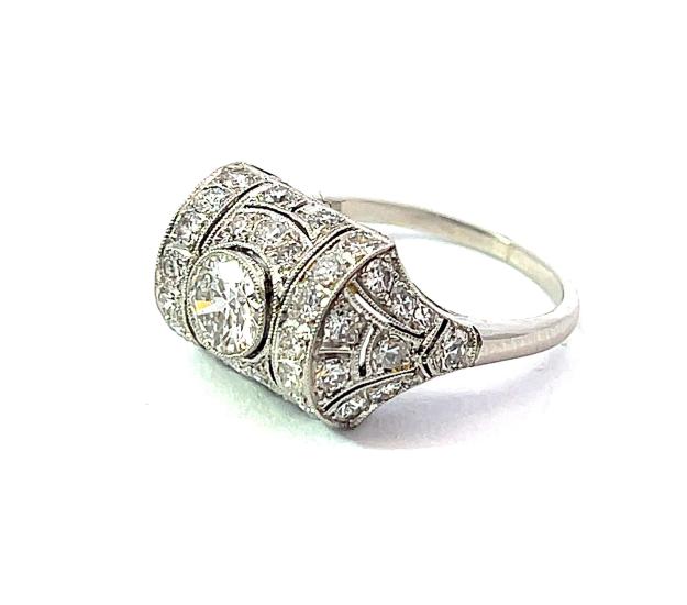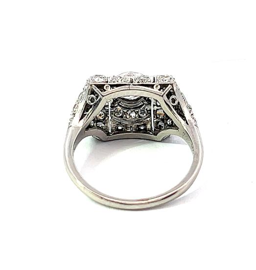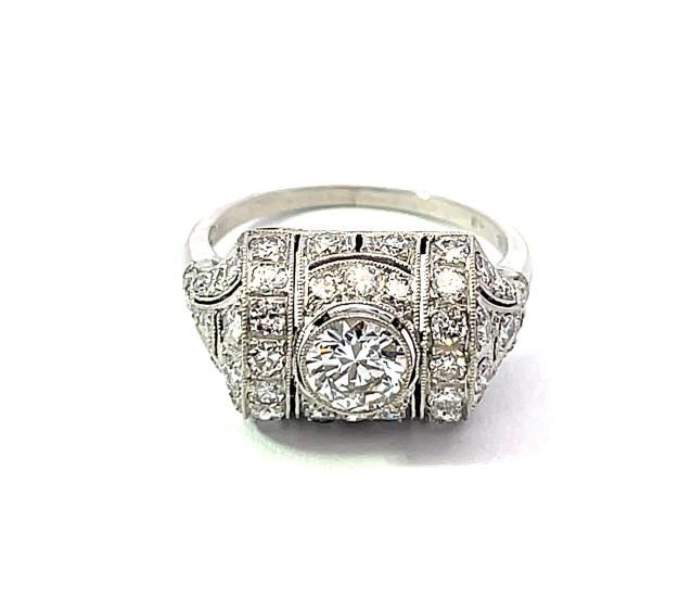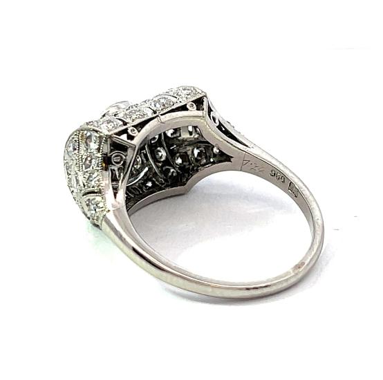 Platinový prsten o ryzosti 950/1000, punc český platný od r. 1949. Velikost 54, váha 5,86 g, v nejširším bodě 11 mm. Kameny viz. odborný posudek - přírodní diamanty celkem cca 1,76 ct.