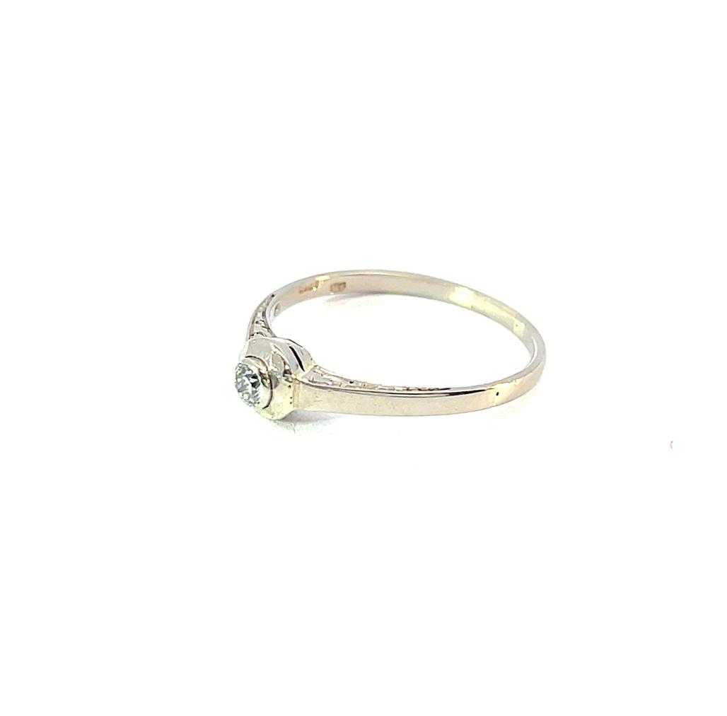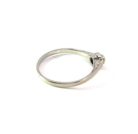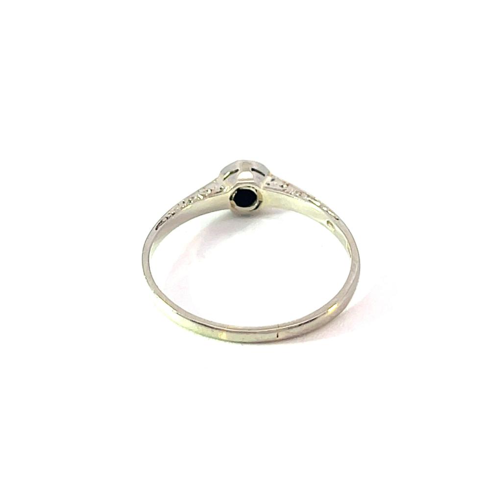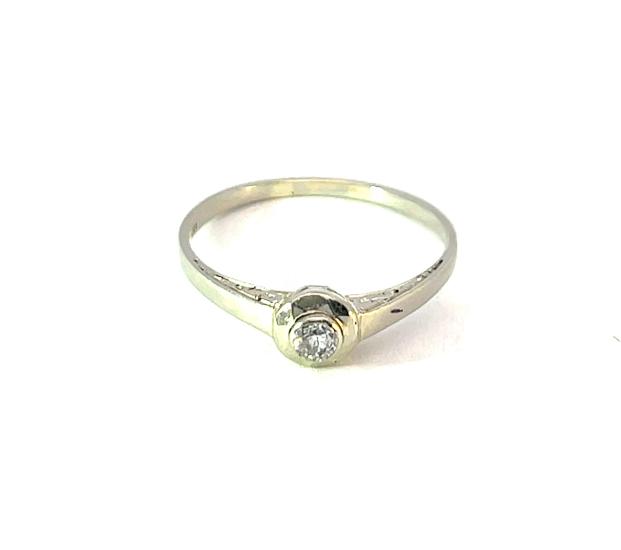 Prsten z bílého zlata o ryzosti 585/1000, punc lvíček. Velikost 57, váha 1,91 g, v nejširším bodě 5,5 mm, Kámen - přírodní diamant - 1 ks, cca 0,1 ct.