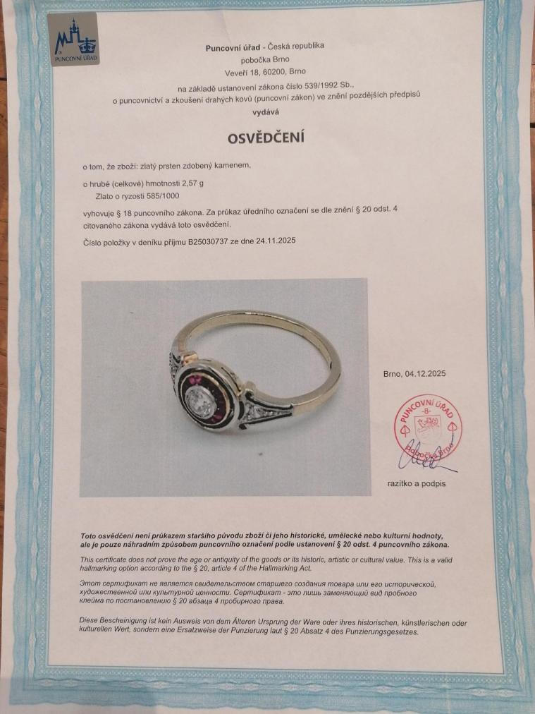 Prsten z kombinace žlutého a bílého zlata o ryzosti 585/1000, osvědčení z PÚ. Velikost 53, váha 2,58 g, v nejširším bodě 8,5 mm. Kámen - syntetický rubín - 16 ks. Kámen - přírodní diamant staroevropského brusu - 3 ks, centrální kámen: 1 ks, cca 0,18 ct, boční kameny: 2 ks, cca 0,02 ct - dohromady cca 0,22 ct.