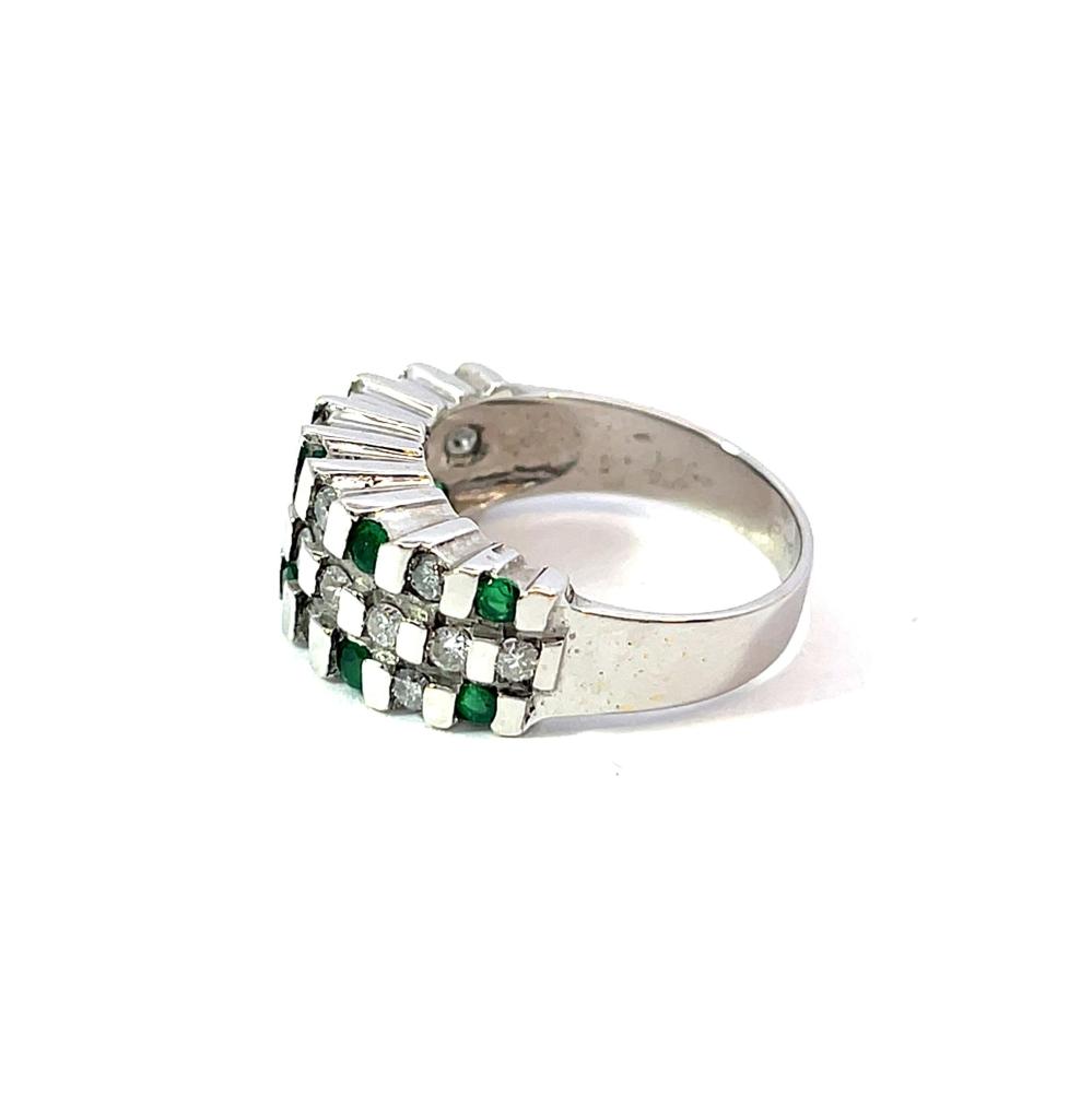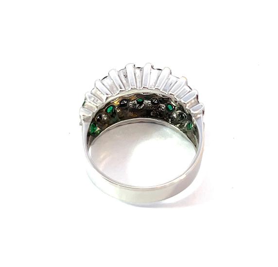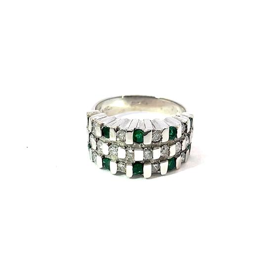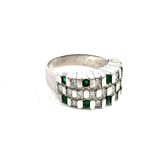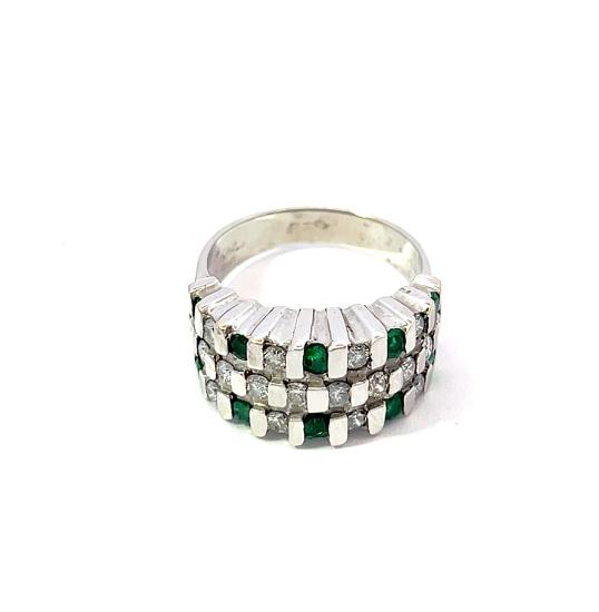 Prsten z bílého zlata o ryzosti 585/1000, punc labuť. Velikost 55, váha 7,56 g, v nejširším bodě 9,5 mm. Kámen - smaragd - 10 ks. Kámen - přírodní diamant briliantového brusu - 18 ks, cca 0,04 ct každý - dohromady cca 0,72 ct. Jeden ze smaragdů je uštípnutý.