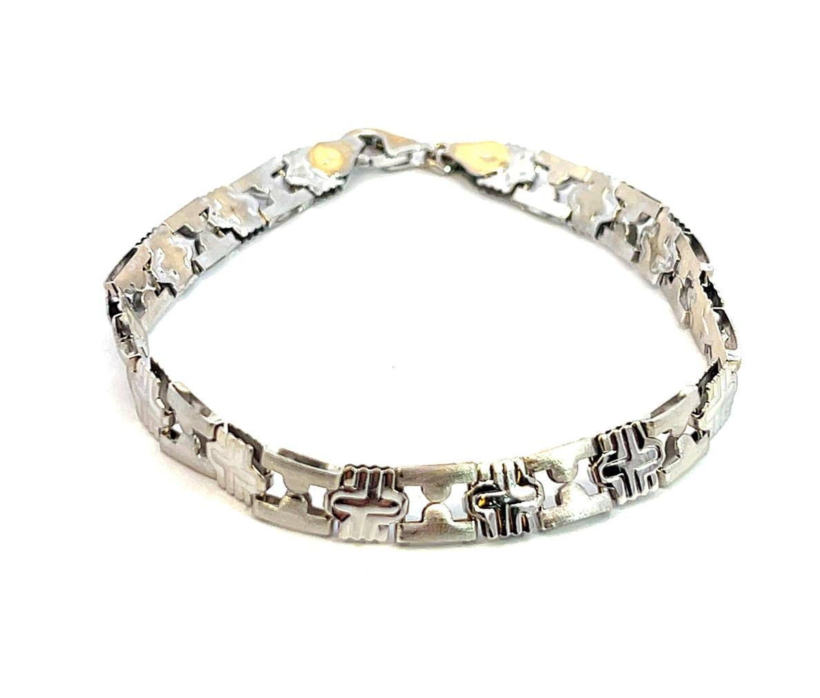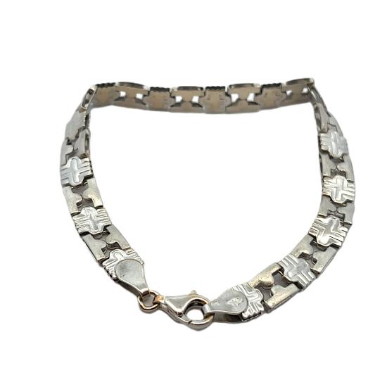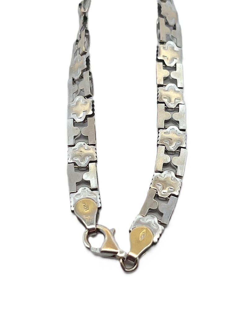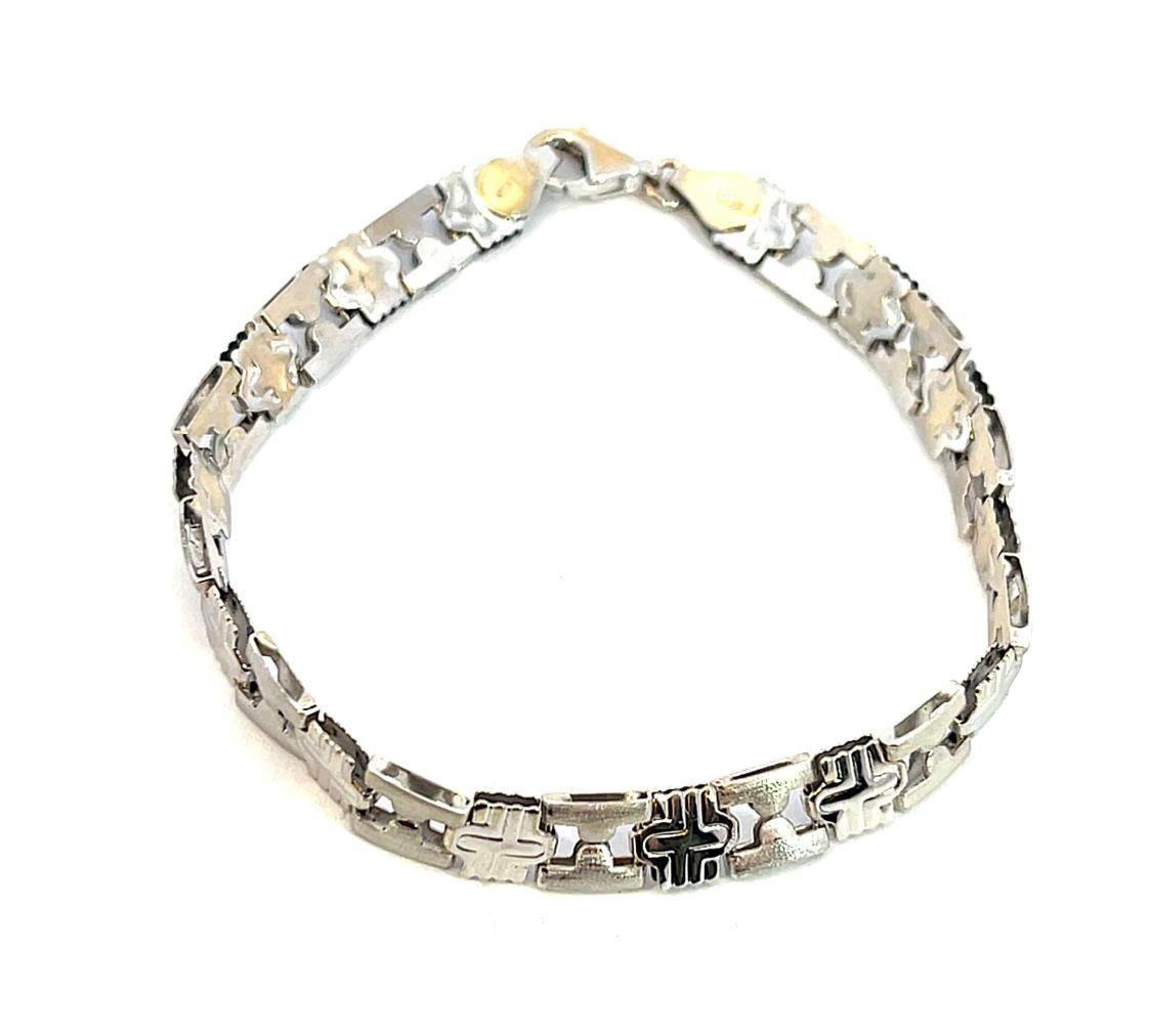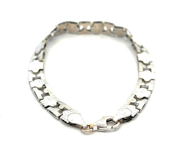 Náramek z bílého zlata o ryzosti 585/1000, punc labuť. Váha 8,60 g, délka 18,3 cm, v nejširším bodě 7 mm.