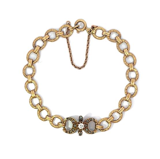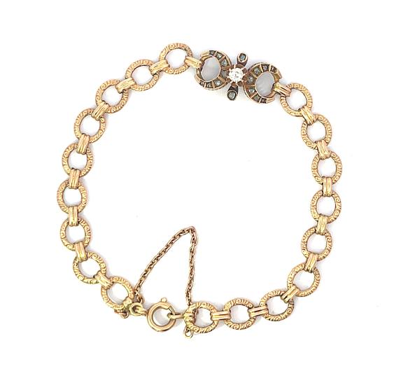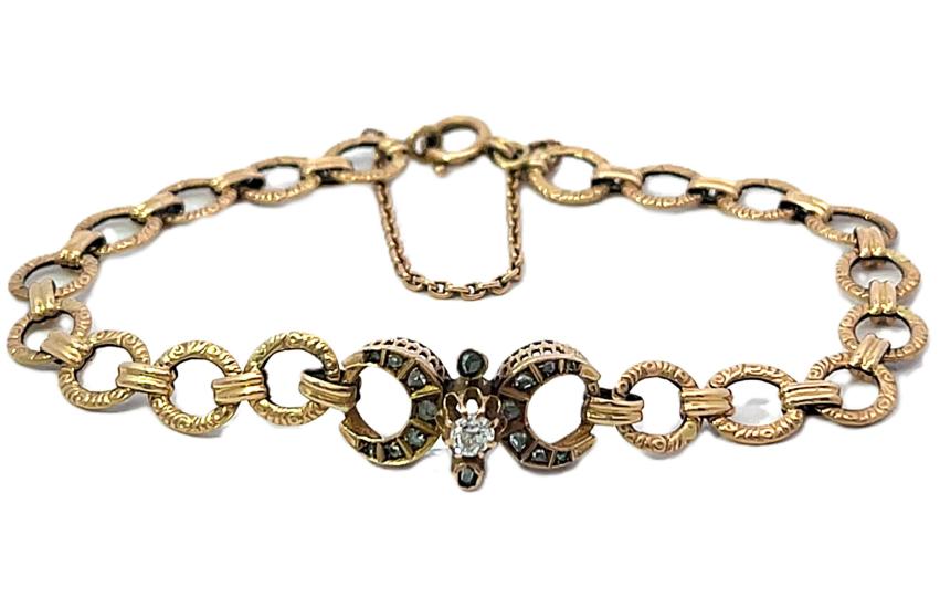 Náramek z růžového zlata o ryzosti 585/1000, punc lvíček. Váha 7,12 g, délka cca 19,7 cm (+/- pár milimetrů, náramek má pojistný řetízek, proto není možné přesné proměření), rozměr ozdobné části 12 x 20,5 mm, náramek v nejširším bodě 7,5 mm. Kámen - přírodní diamant staroevropského brusu - 1 ks, cca 0,10 ct. Kámen - přírodní diamant routa - 16 ks.