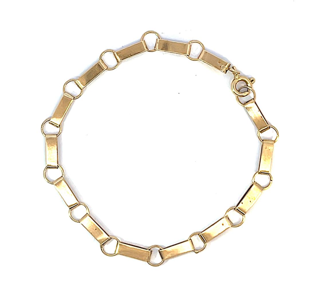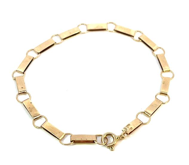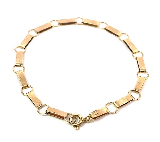 Náramek z růžového zlata o ryzosti 585/1000, punc klas (Z-56) a ryz. č. 585. Váha 4,92 g, délka 19,5 cm, v nešjrším bodě 6 mm.