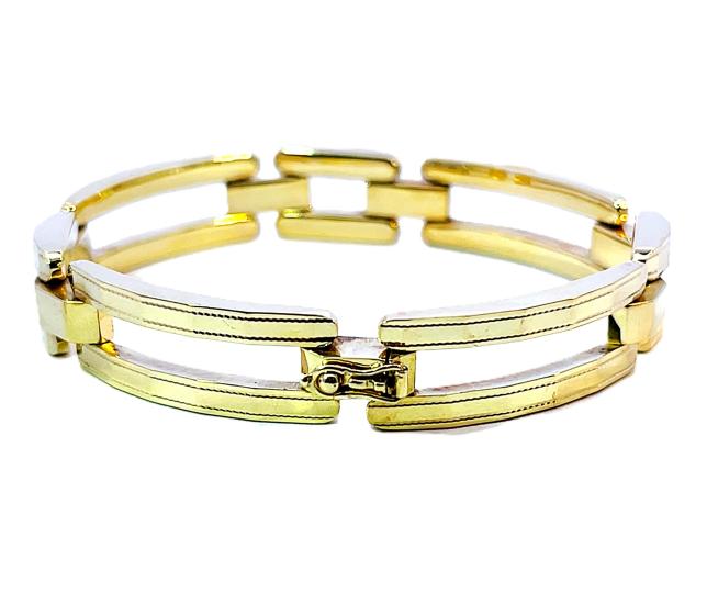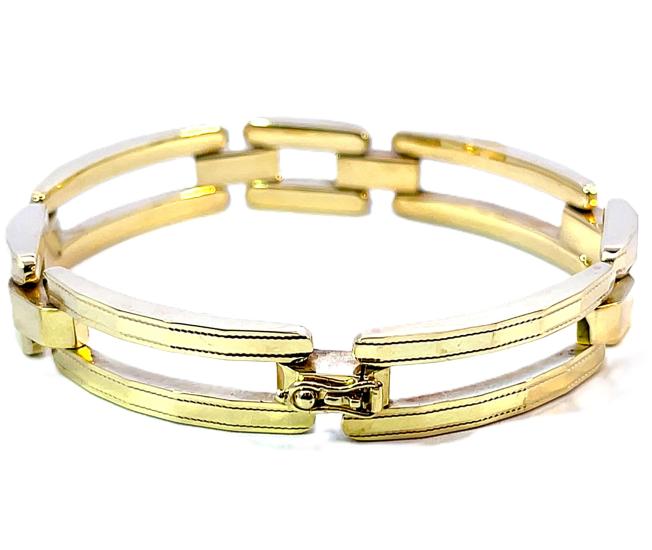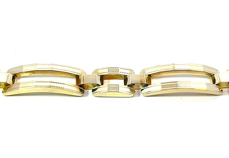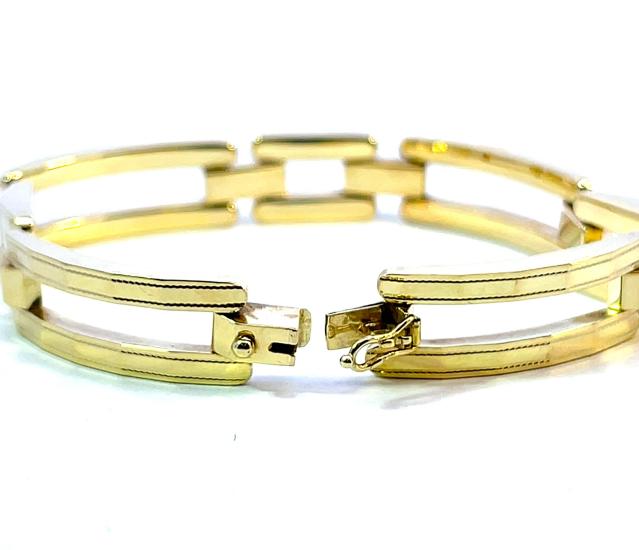Zlatý náramek o ryzosti 585/1000, punc lvíček. Váha 13,75 g, délka 17 cm, v nejširším bodě 10,5 mm.