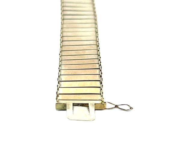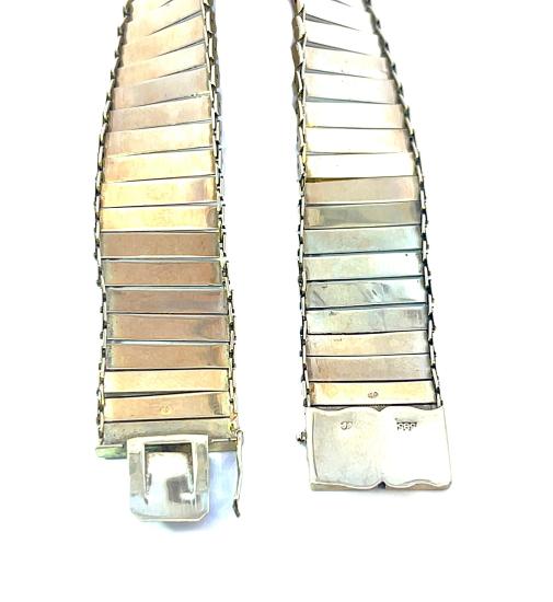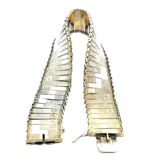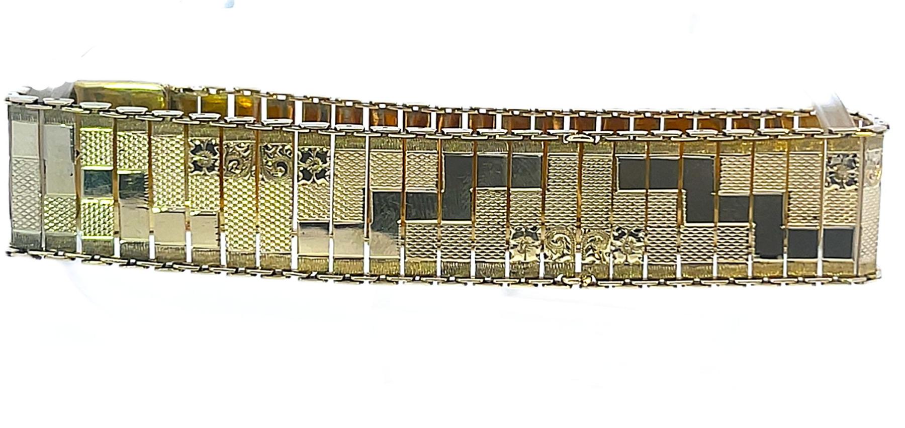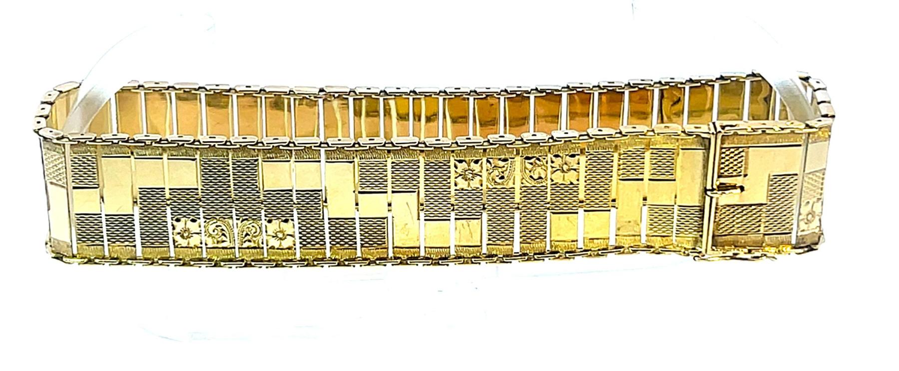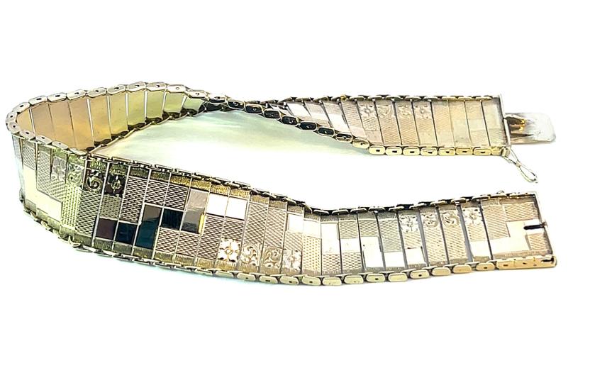 Starožitný zlatý náramek o ryzosti 585/1000, punc lvíček. Váha 16,11 g, délka 20 cm, v nejširším bodě 16,5 mm. Dva články jsou zezadu lehce zdeformované.