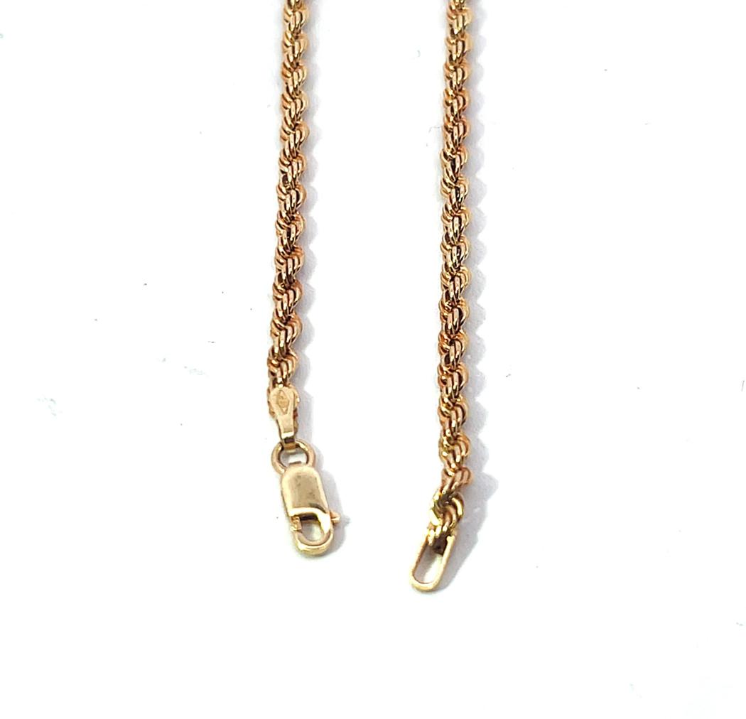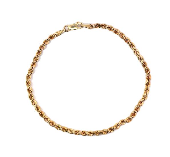 Zlatý náramek o ryzosti 585/1000, punc labuť. Váha 1,68 g, délka 18,7 cm, v nejširším bodě 3 mm.