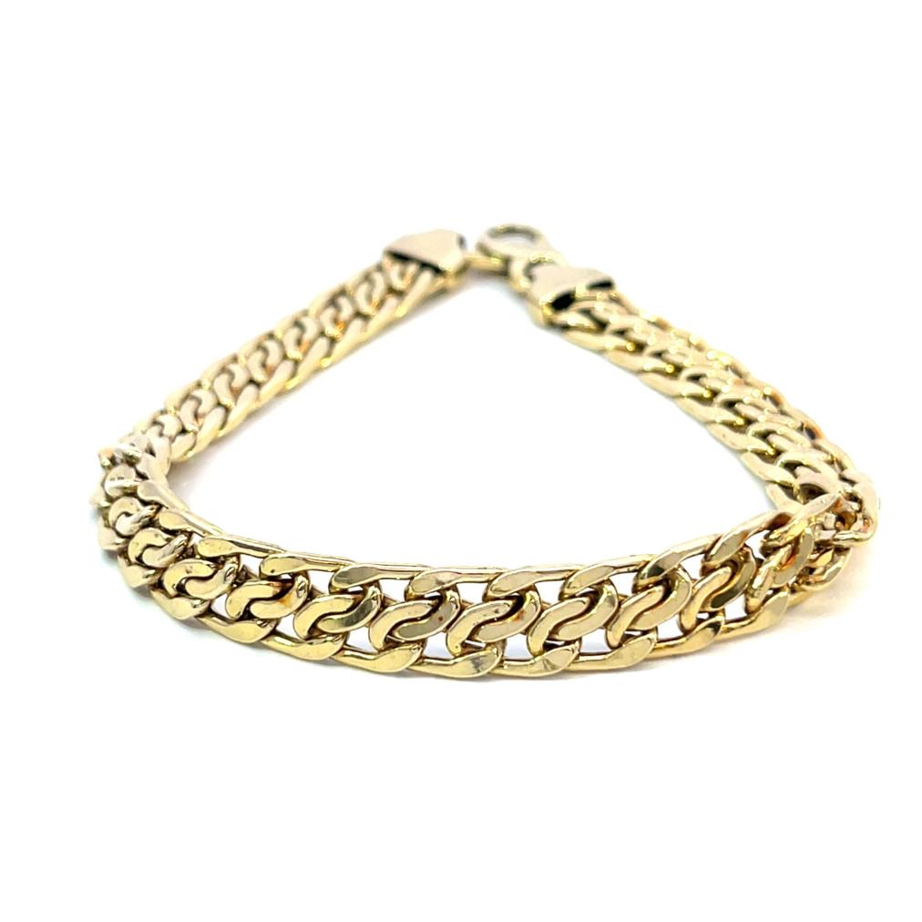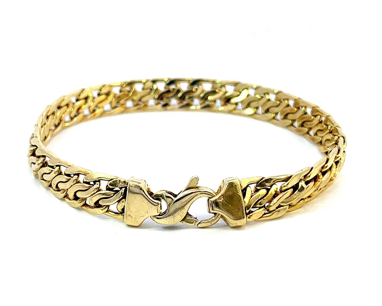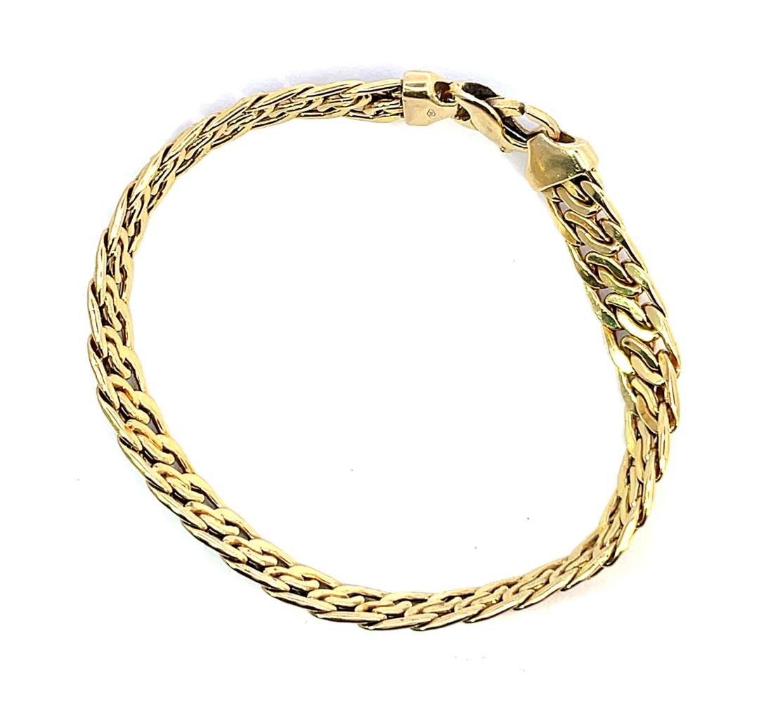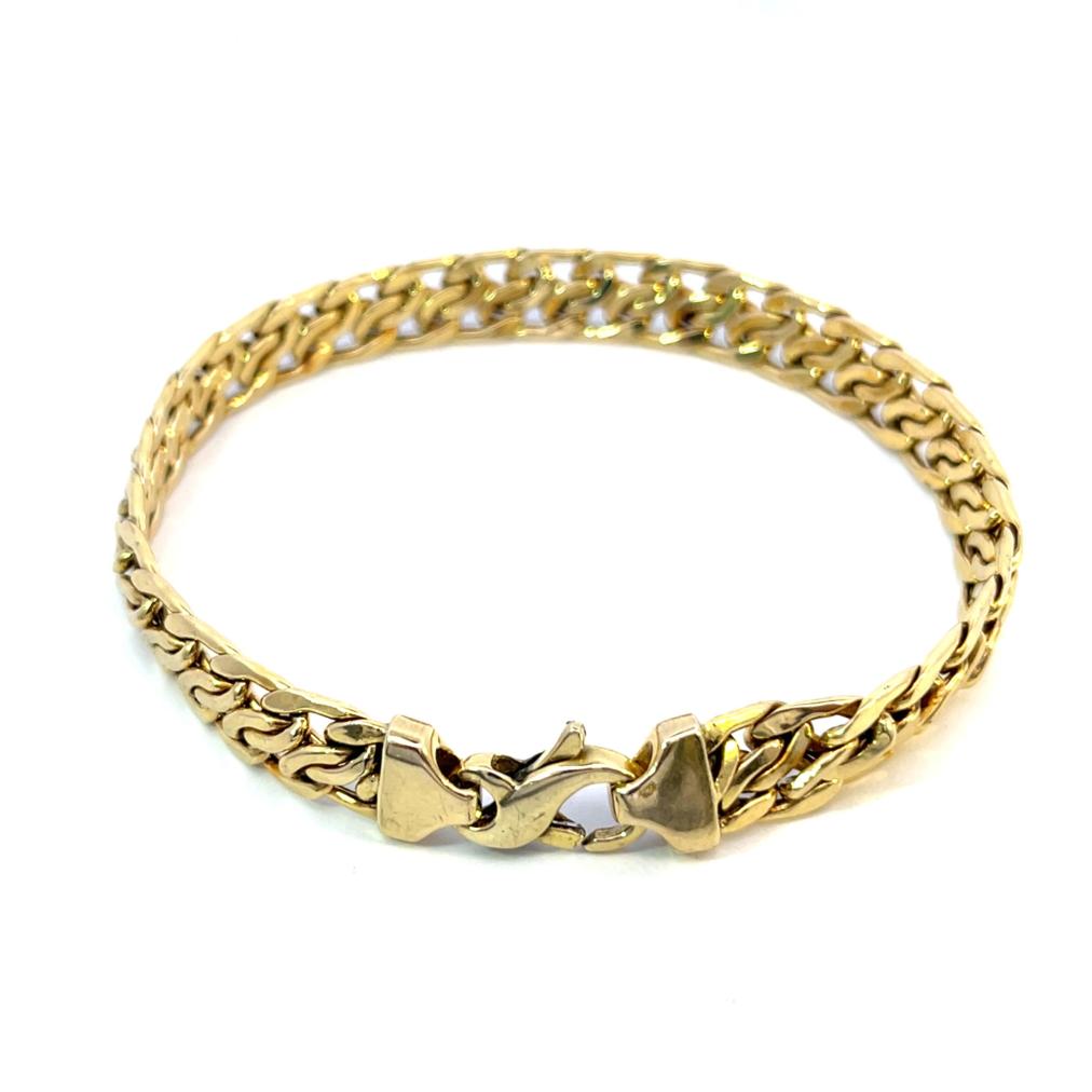 Zlatý náramek o ryzosti 585/1000, punc labuť. Váha 11,62 g, délka 20 cm, v nejširším bodě 8 mm.