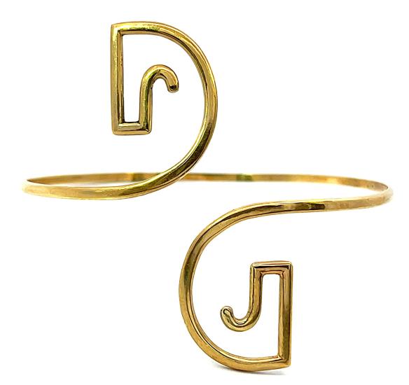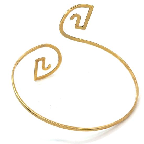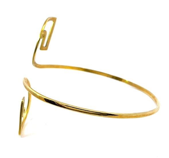Zlatý náramek o ryzosti 585/1000, punc labuť. Váha 13,92 g, v nejširším bodě 62 mm, šířka 2 mm, vnitřní průměr 75 mm.