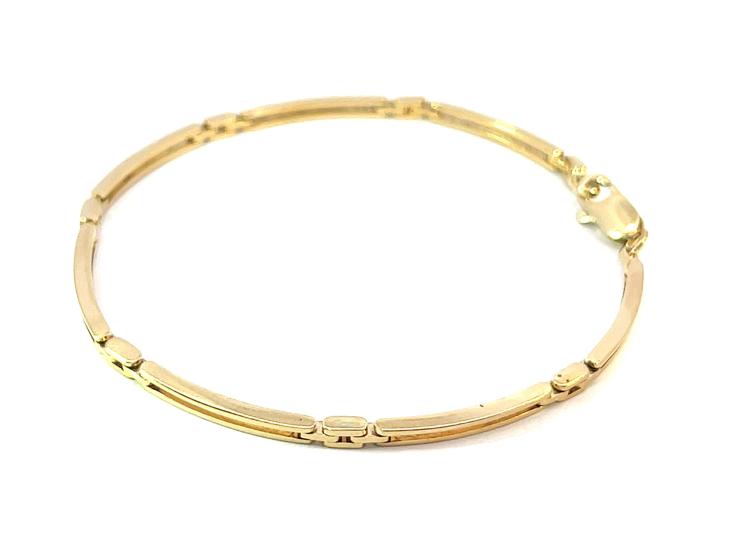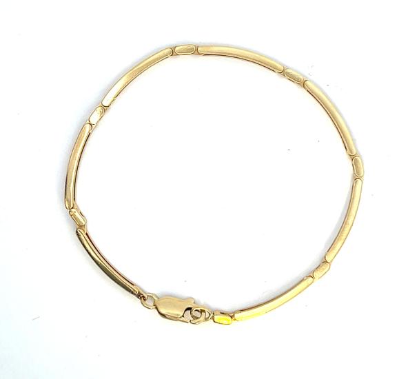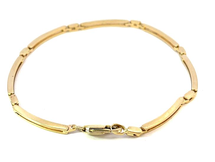 Zlatý náramek o ryzosti 585/1000, punc labuť. Váha 8,95 g, délka 19,5 cm, v nejširším bodě 2,5 mm.