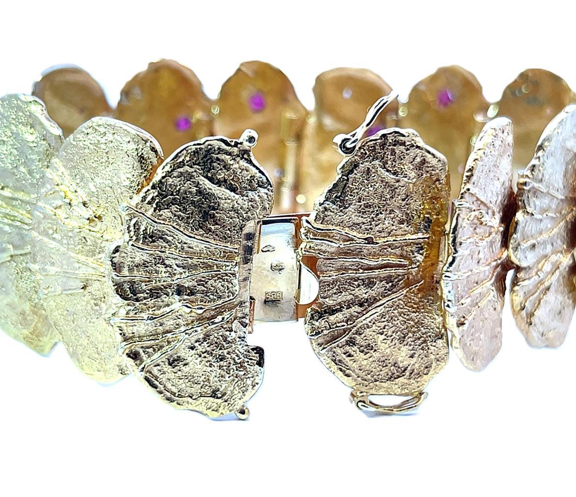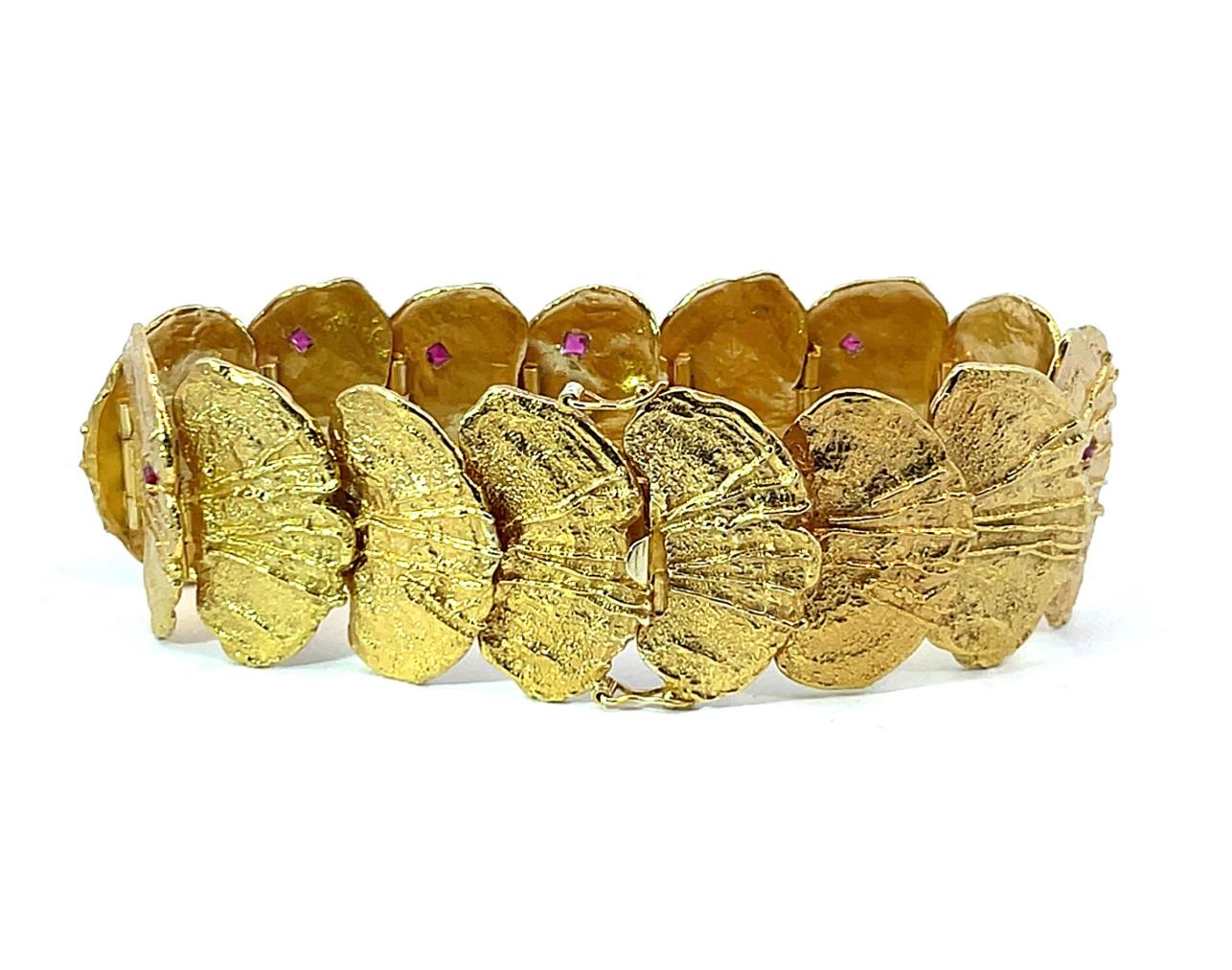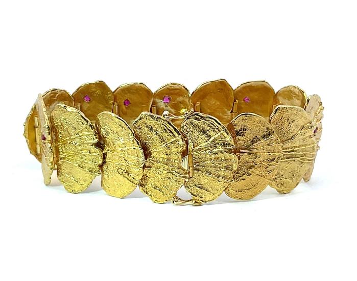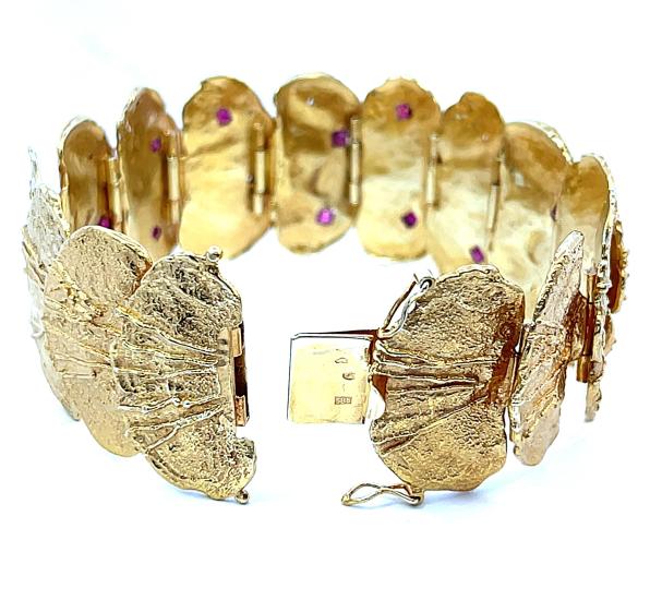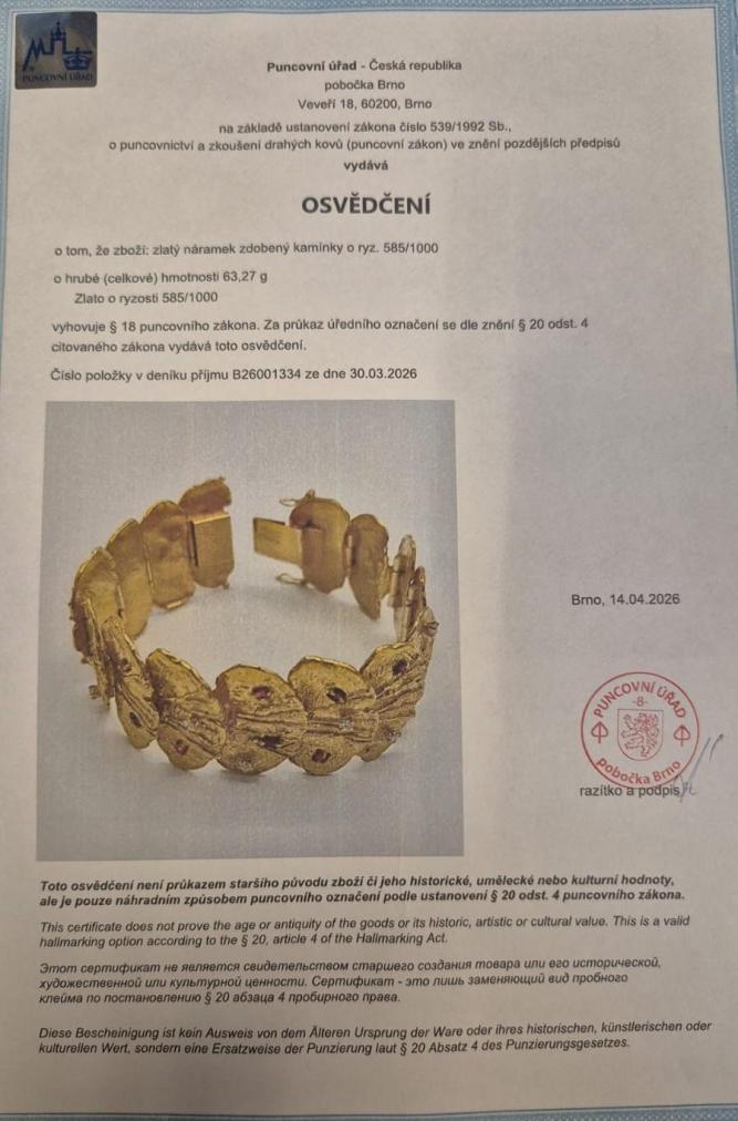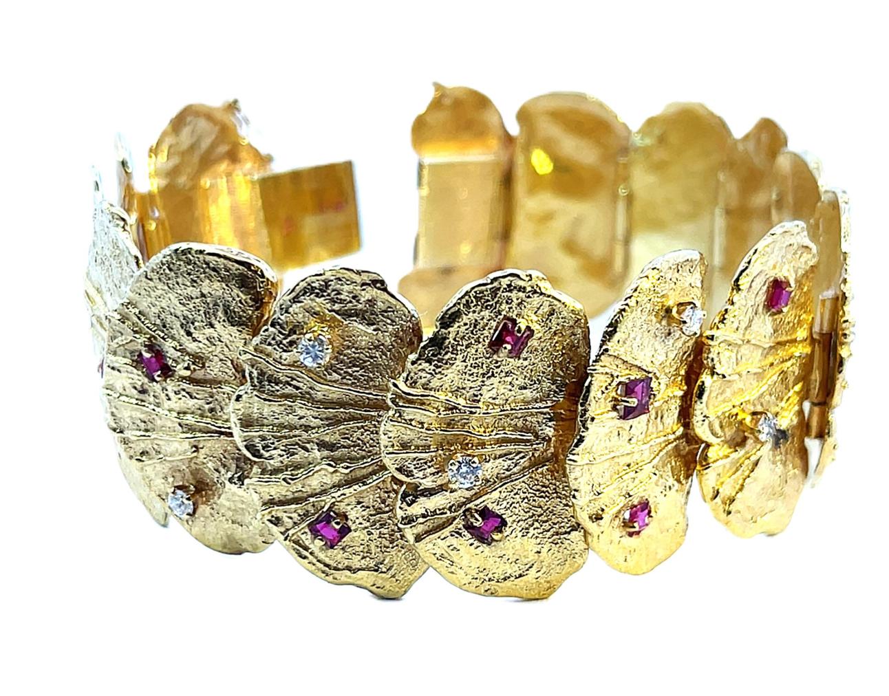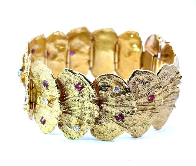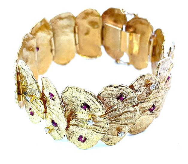 Zlatý náramek o ryzosti 585/1000, osvědčení z PÚ. Váha 63,27 g, délka 19 cm, v nejširším bodě 28 mm. Kámen - přírodní rubín - 12 ks. Kámen - přírodní diamant briliantového brusu - 6 ks, cca 0,05 ct každý - dohromady cca 0,30 ct.