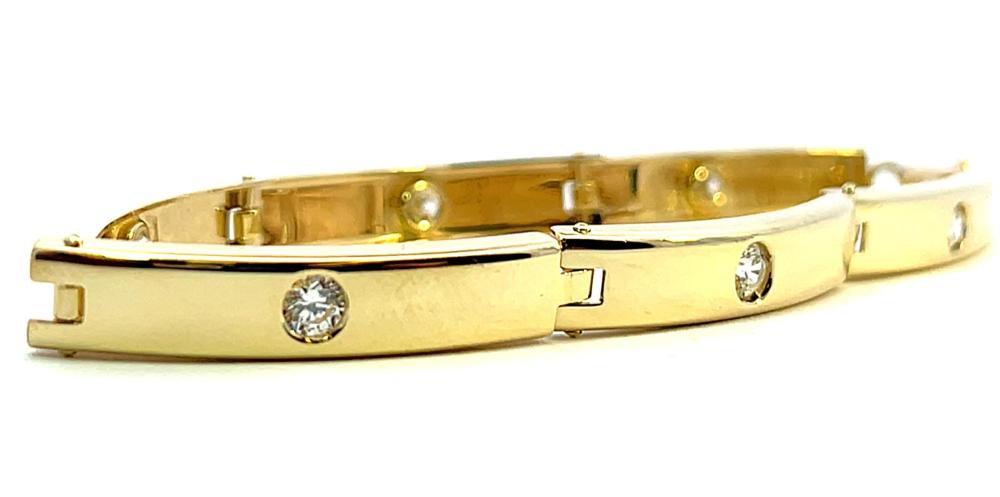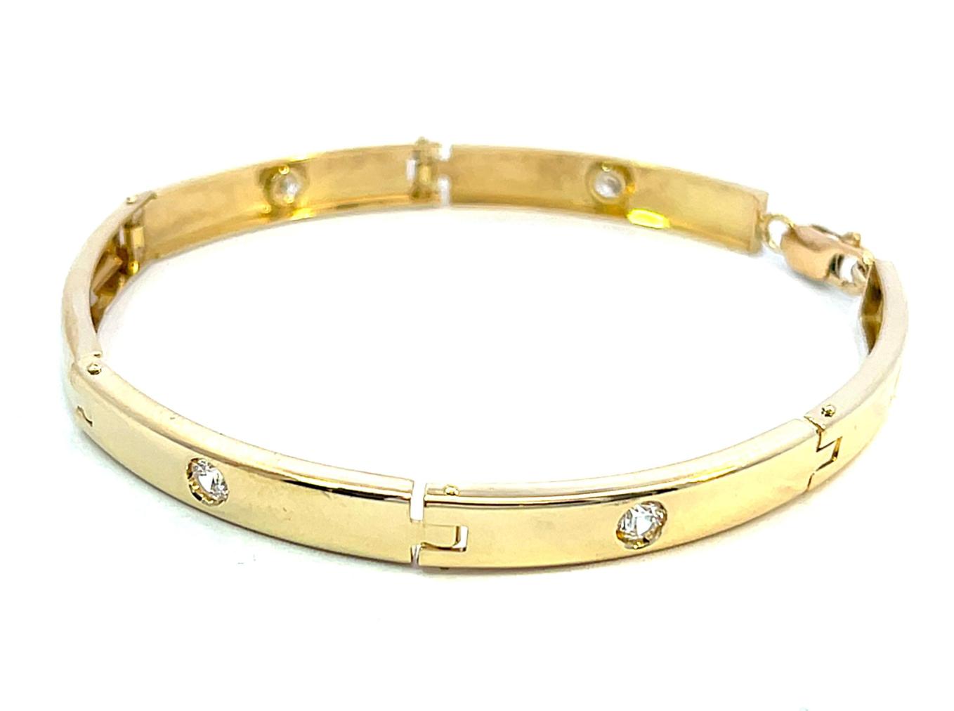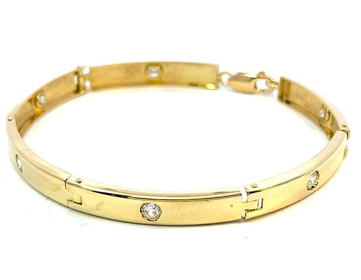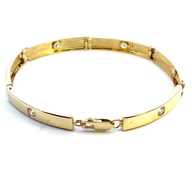 Zlatý náramek o ryzosti 585/1000, punc labuť. Váha 11,89 g, délka 19,5 cm, v nejširším bodě 6 mm.