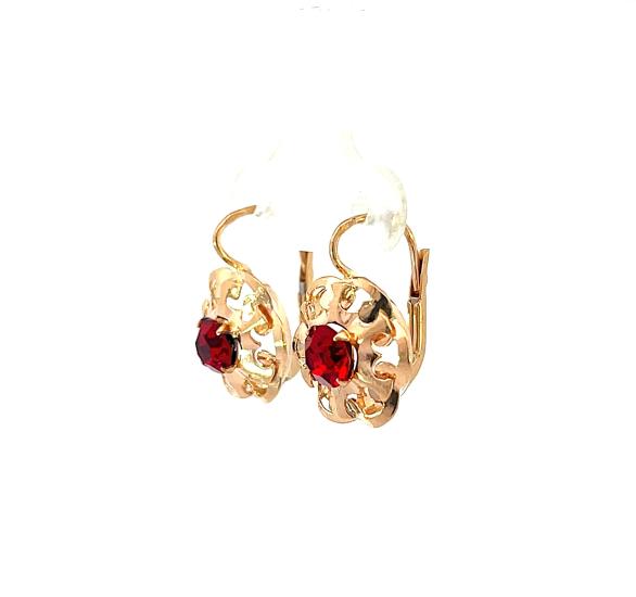 Náušnice z růžového zlata o ryzosti 583/1000, punc klas a ryz. č. 583. Váha 3,24 g, výška 18,5 mm, průměr ozdoby 14 mm, průměr kamene 5,5 mm. Kameny jsou syntetické.