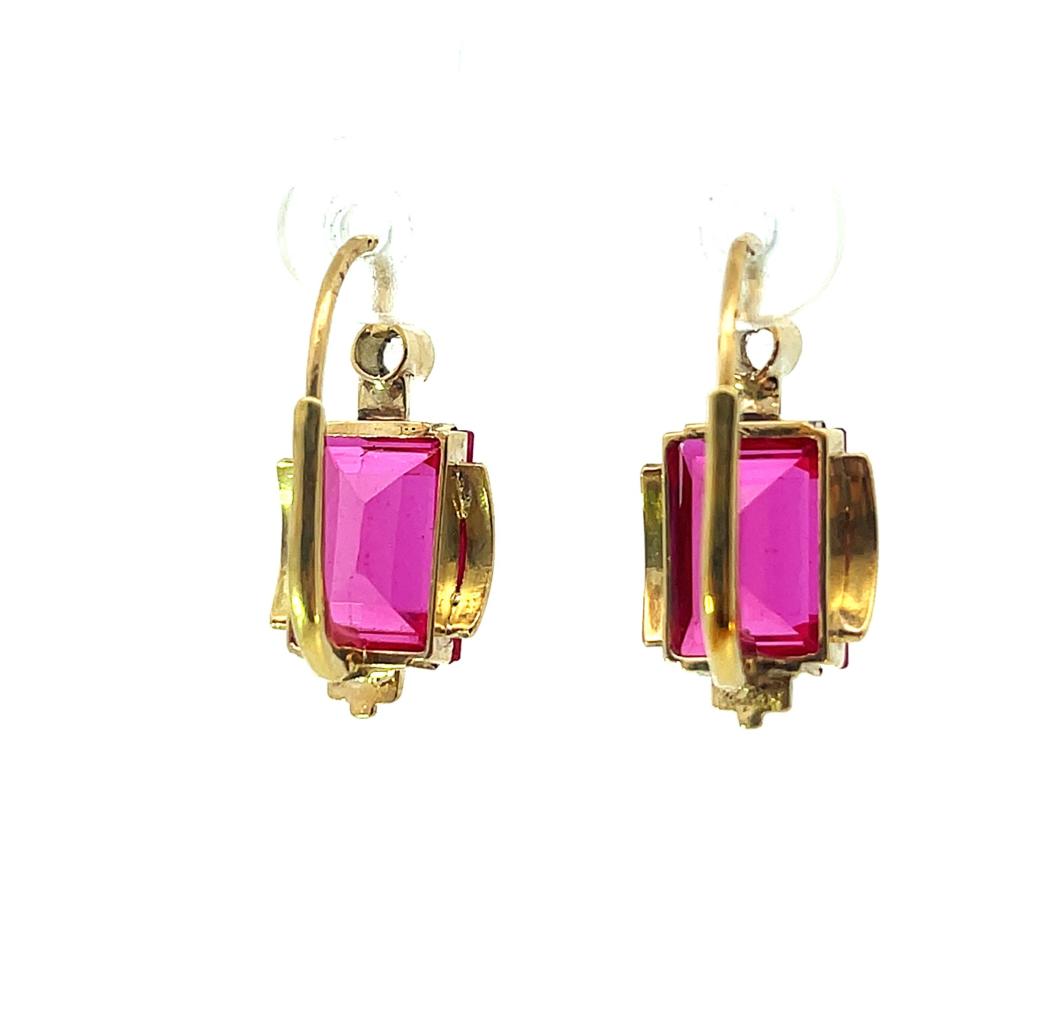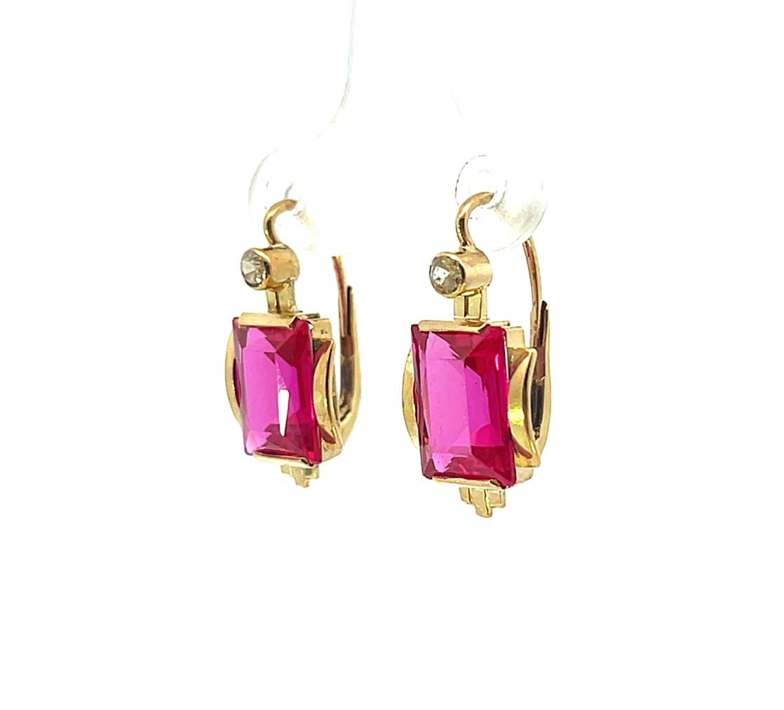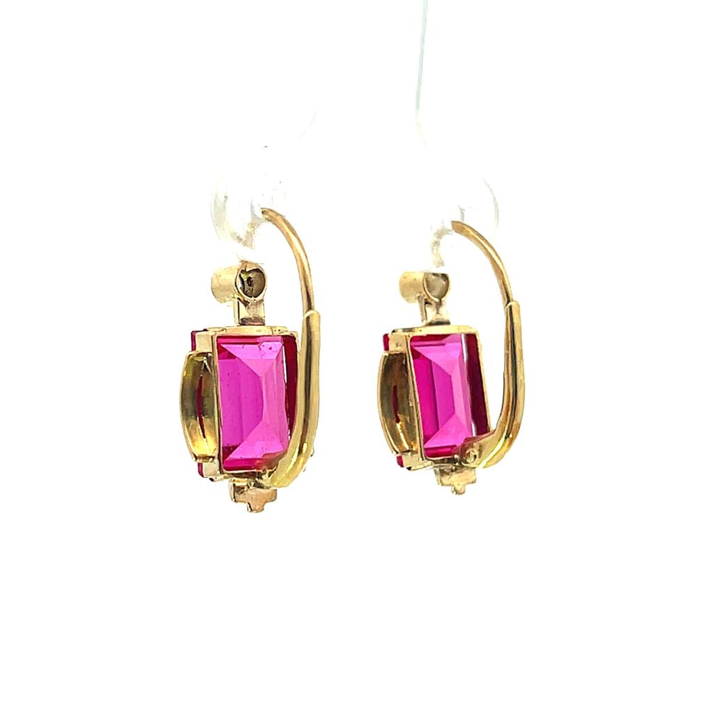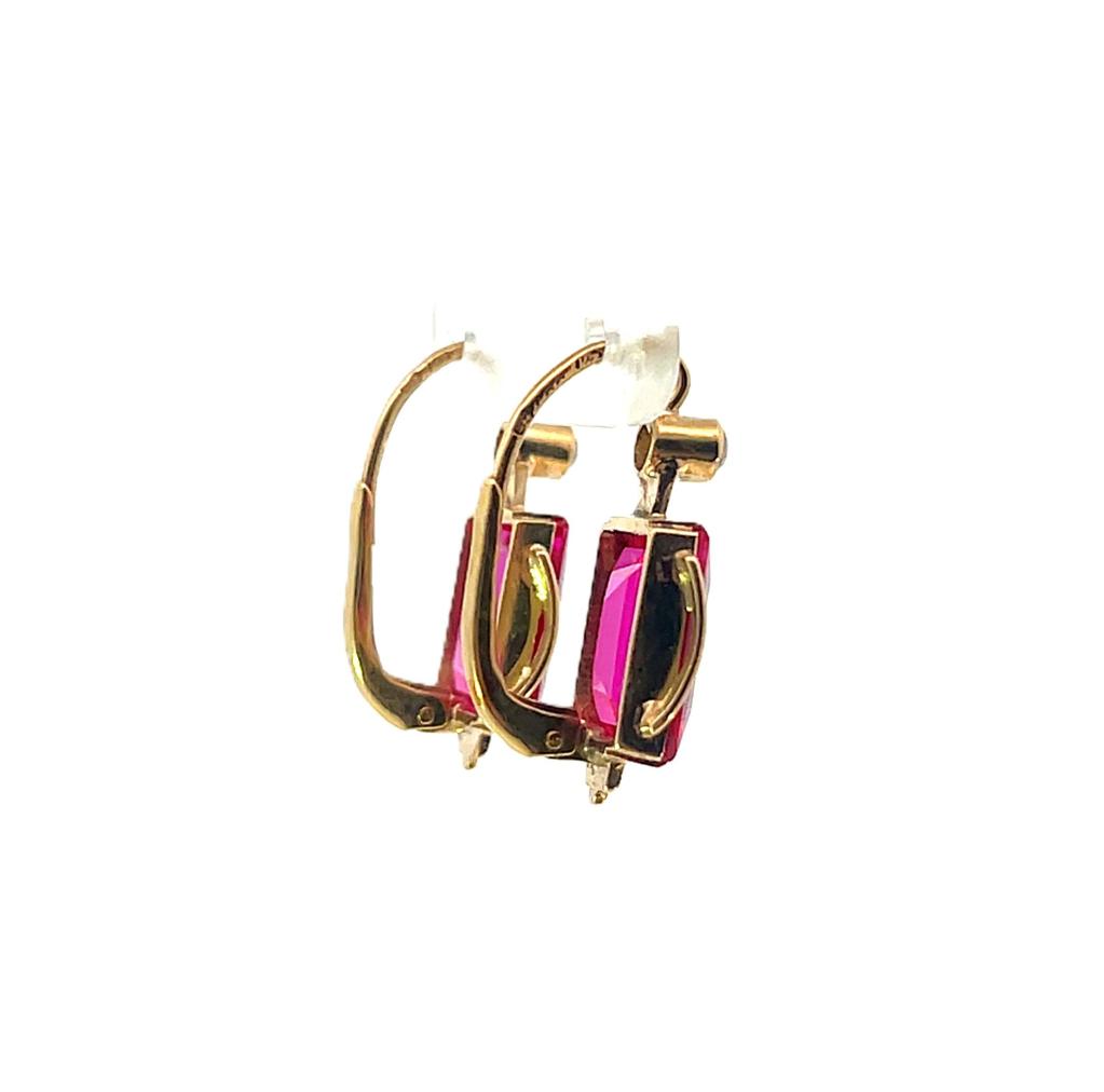 Zlaté náušnice o ryzosti 585/1000, punc lvíček. Váha 3,98 g, výška 21 mm, v nejširším bodě 10 mm. Kameny jsou syntetické.