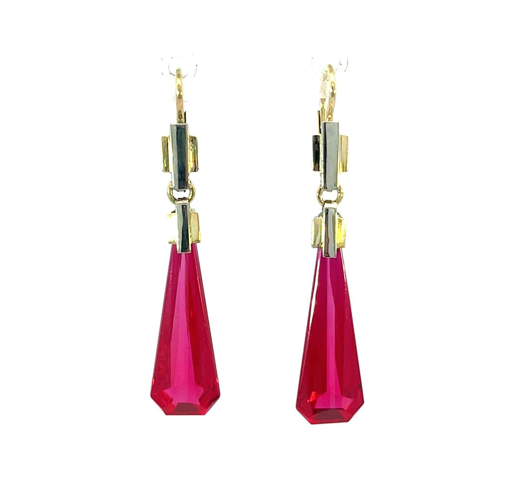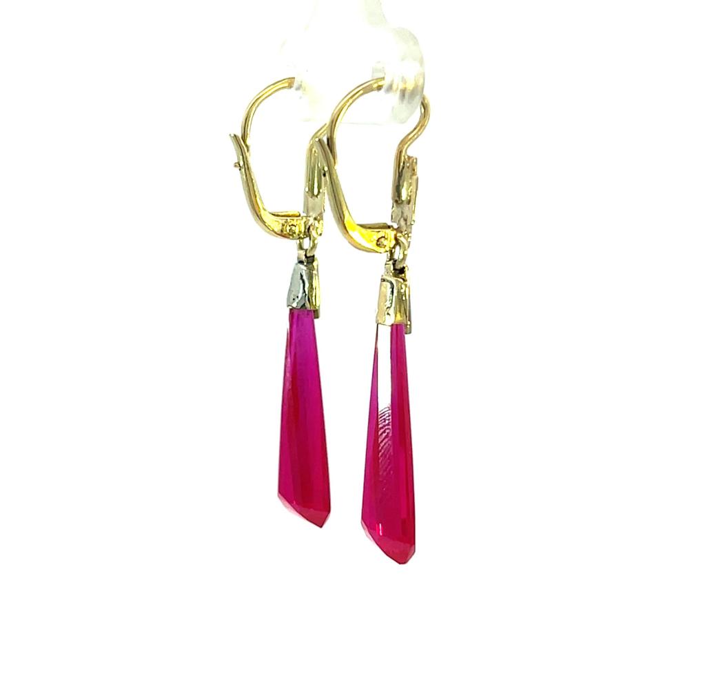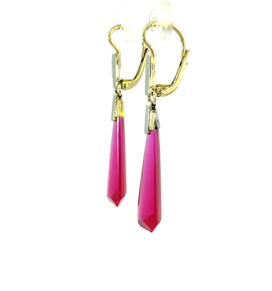 Náušnice z kombinace žlutého a bílého zlata o ryzosti 585/1000, punc lvíček. Váha 3,85 g, výška 40 mm, v nejširším bodě 8 mm. Kameny jsou syntetické. Jedna z náušnic byla opravovaná, ze zadní strany má kov bílou barvu - viz. foto.