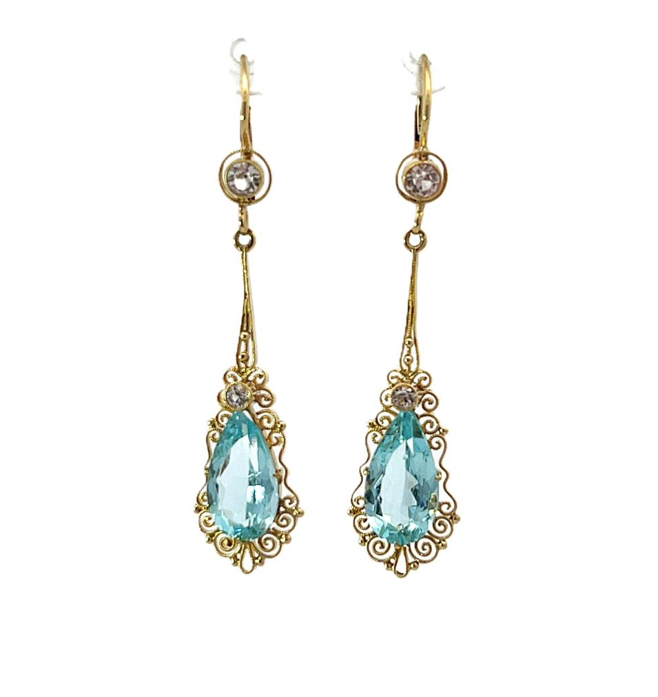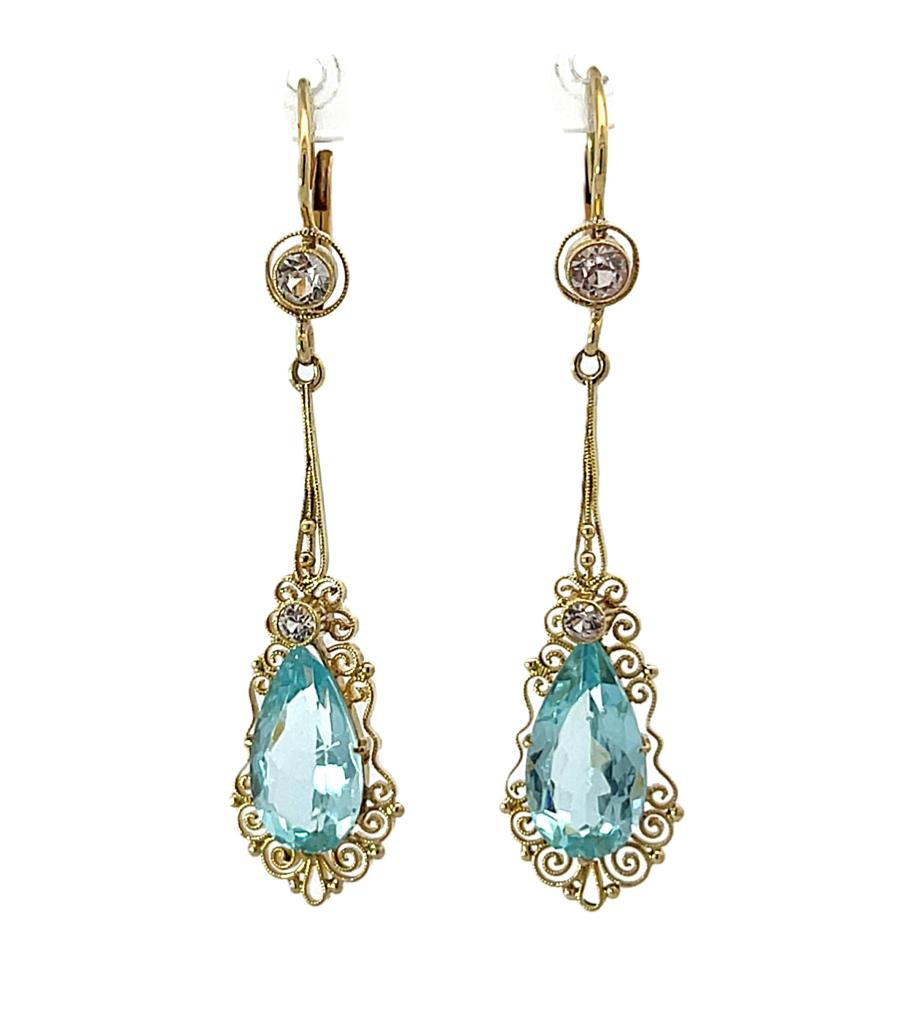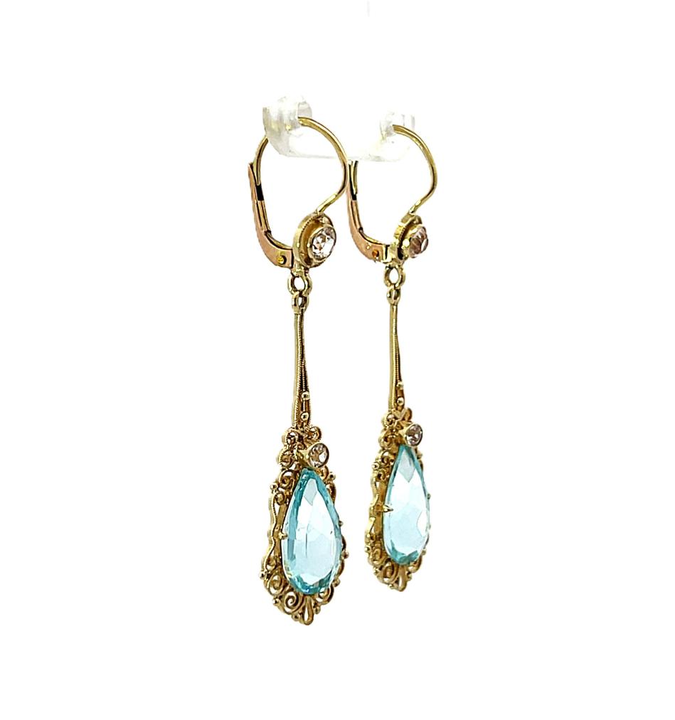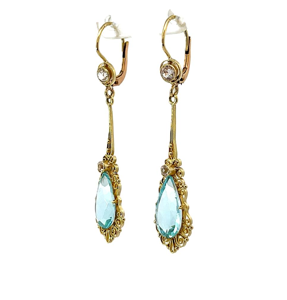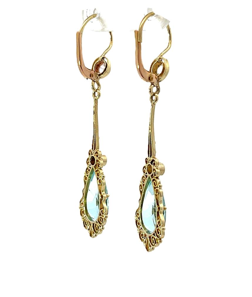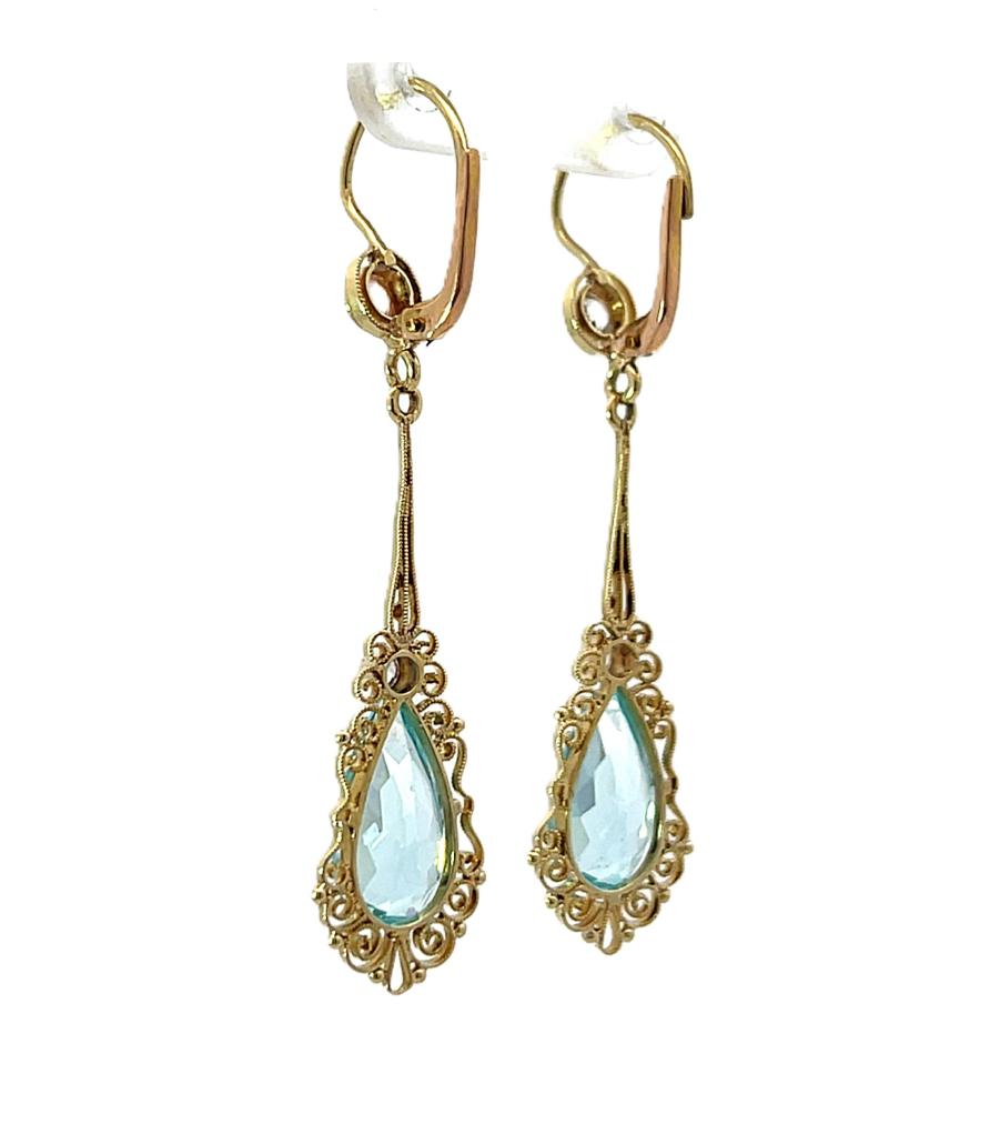 Zlaté náušnice o ryzosti 585/1000, punc čejka. Váha 4,16 g, výška 49 mm, v nejširším bodě 11 mm. Akvamaríny jsou syntetické.