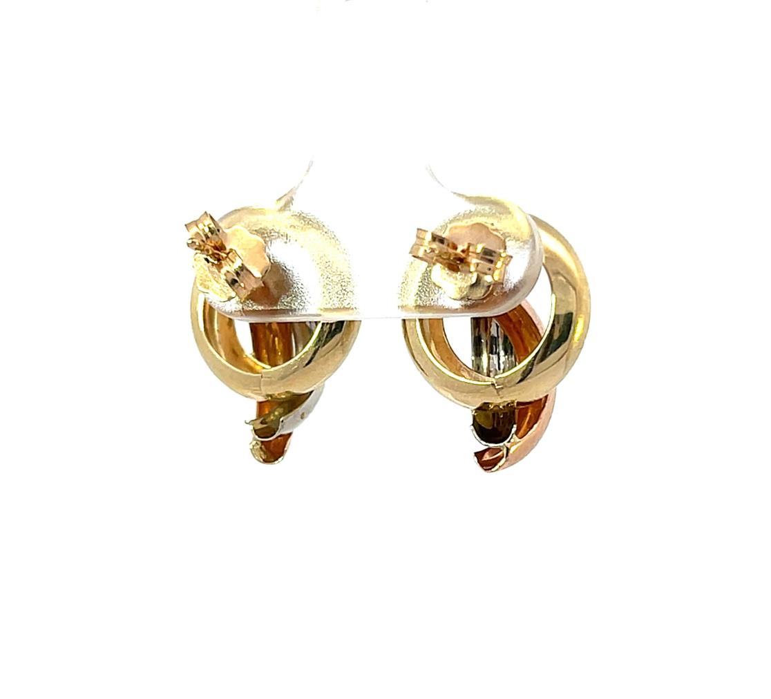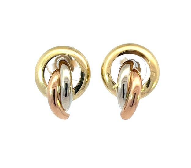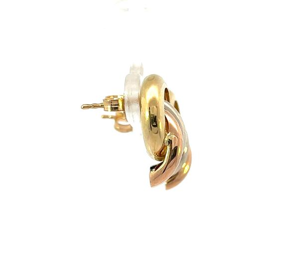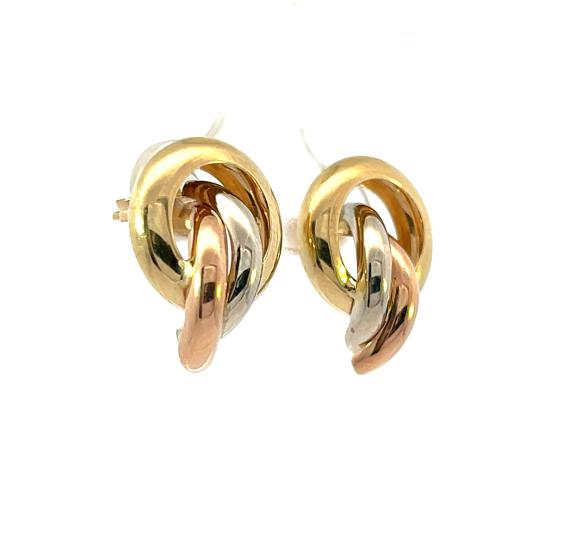 Náušnice z kombinace žlutého, bílého a růžového zlata o ryzosti 585/1000, punc labuť. Váha 2,57 g, výška 18,5 mm, v nejširším bodě 14 mm.