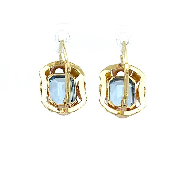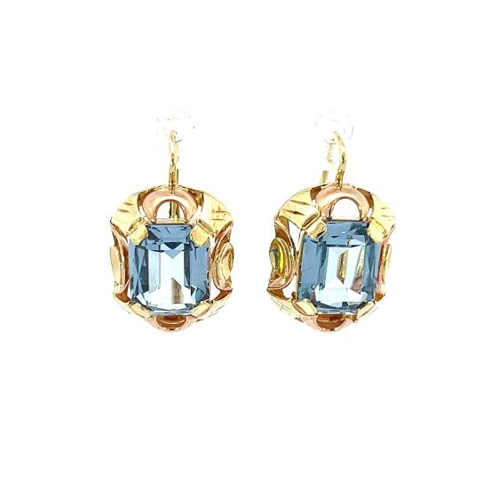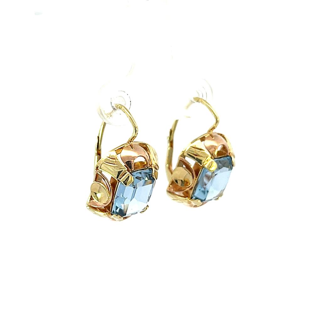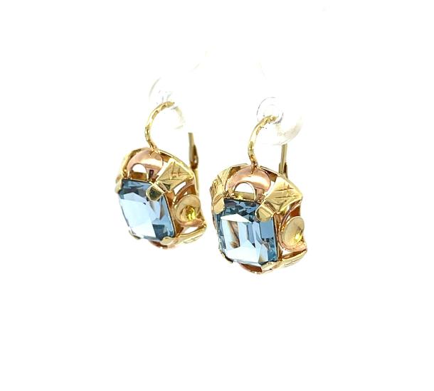 Náušnice z kombinace žlutého a růžového zlata o ryzosti 585/1000, punc čejka. Váha 5,76 g, výška 21 mm, v nejširším bodě 13 mm. Kameny jsou syntetické.