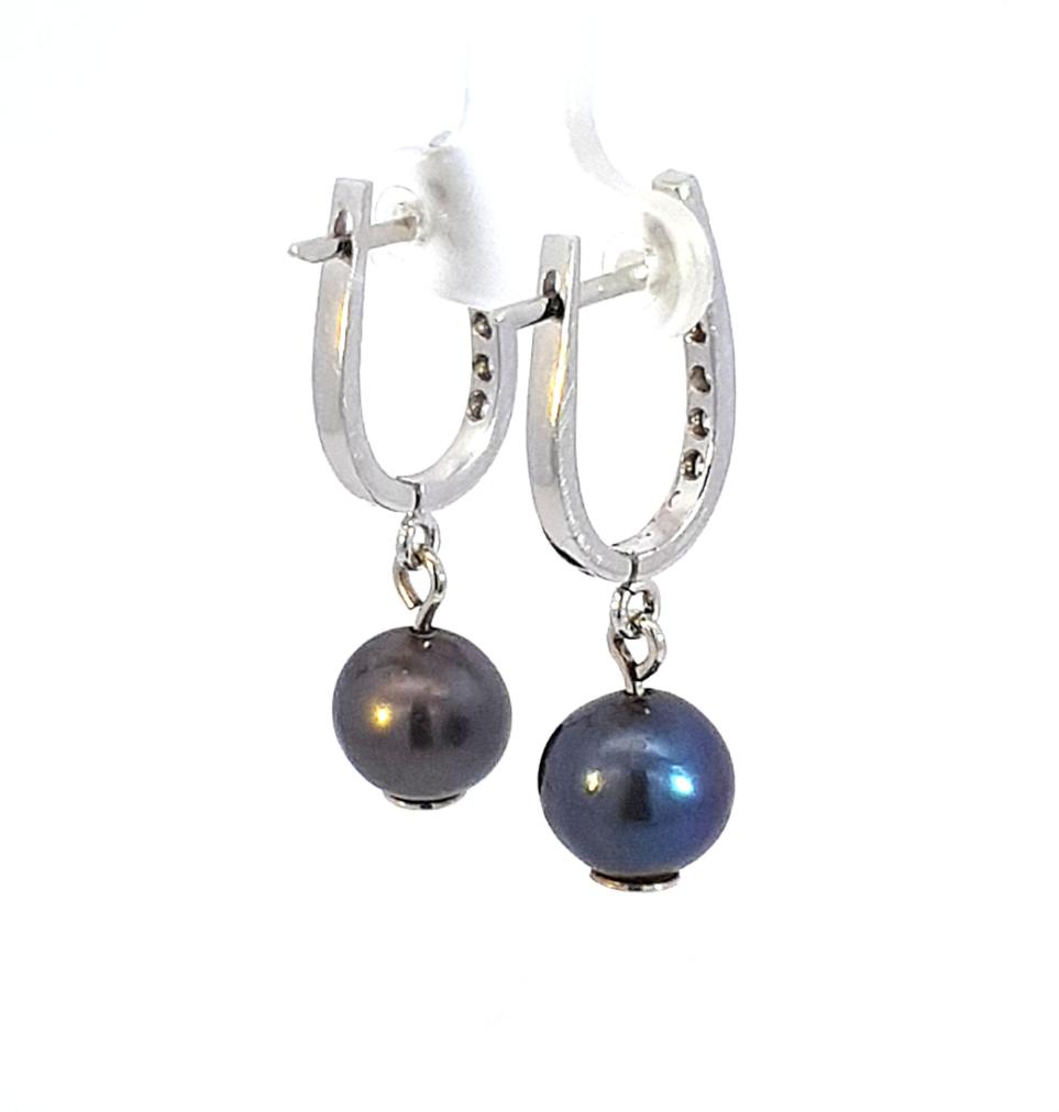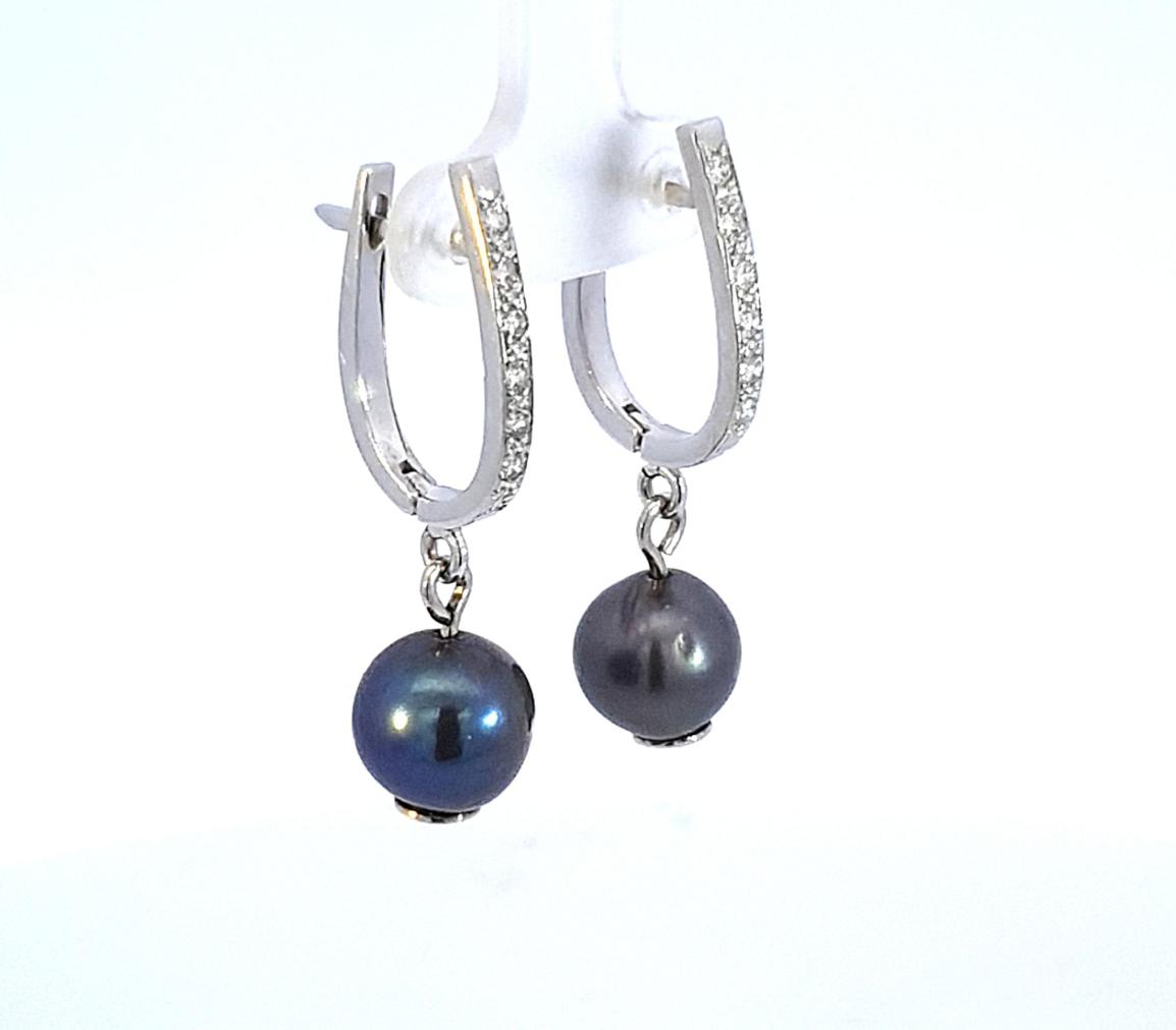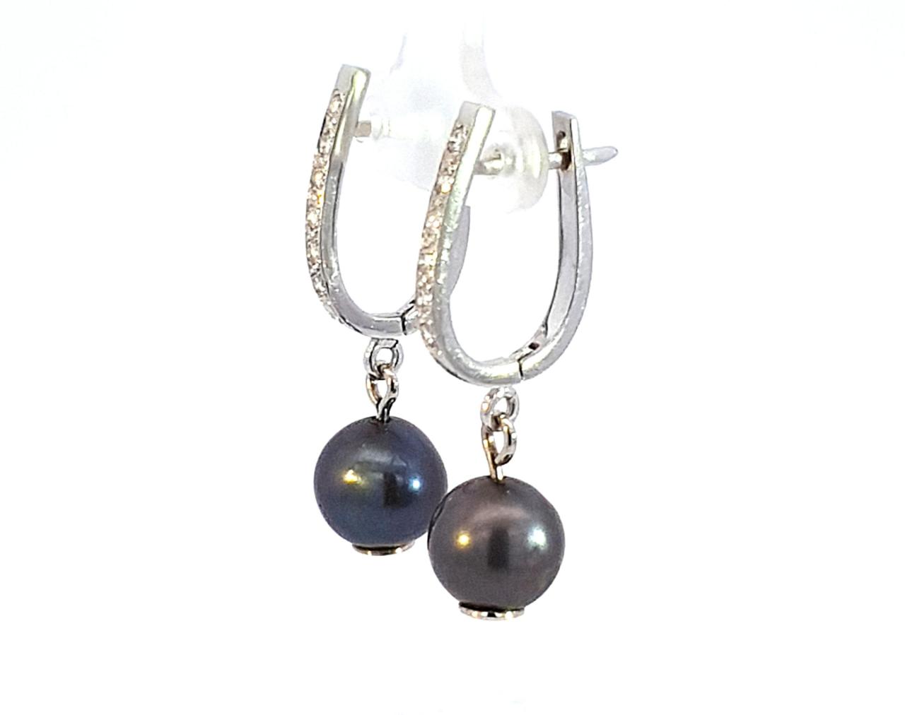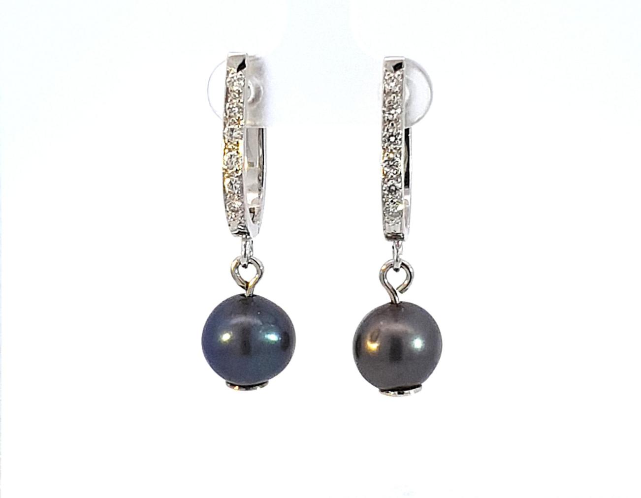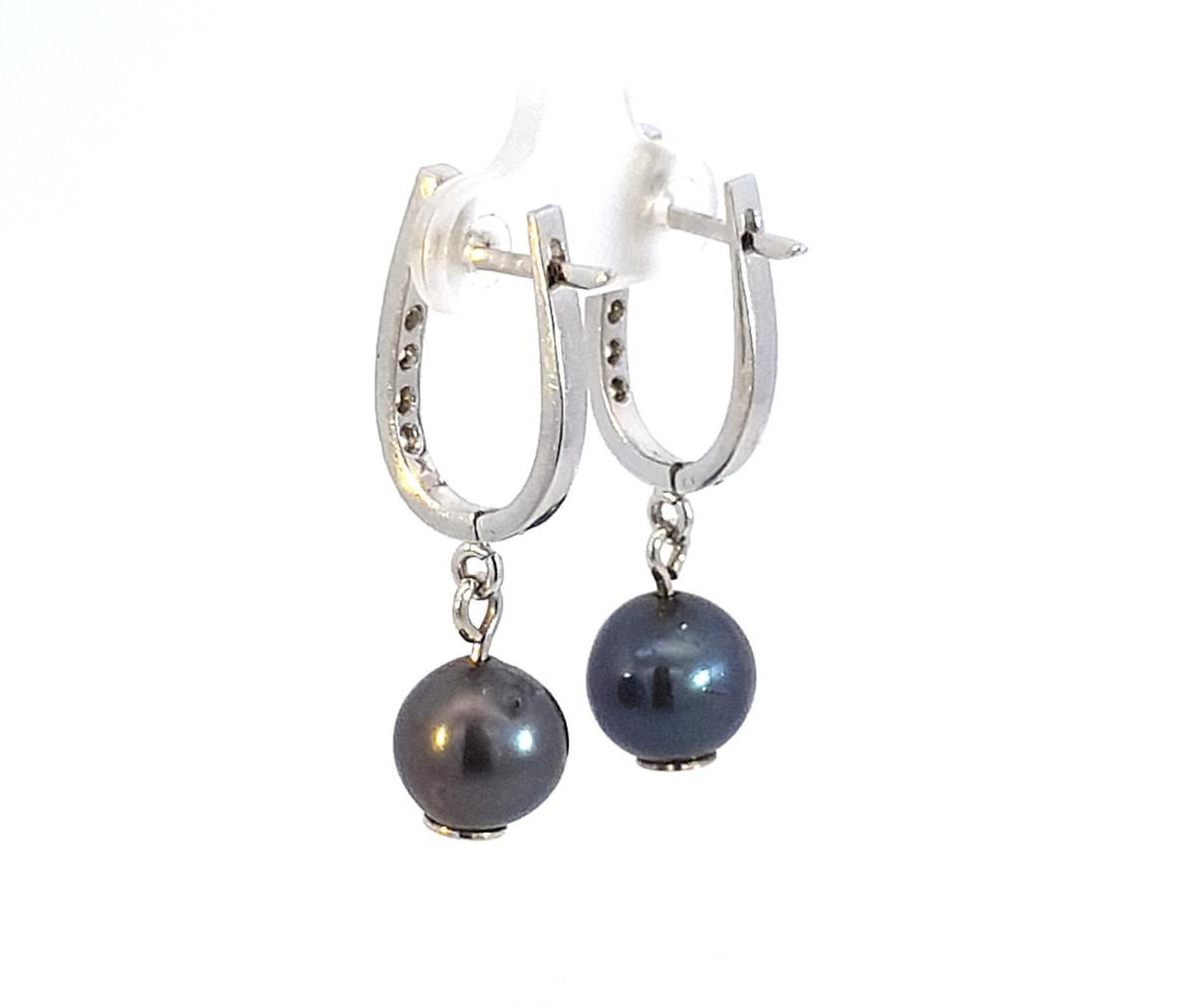 Náušnice z bílého zlata o ryzosti 585/1000, punc labuť. Váha 7,90 g, výška 37 mm, průměr perly 10,5 mm. Kámen - přírodní diamant briliantového brusu - 12 ks, cca 0,04 ct každý - dohromady cca 0,48 ct.