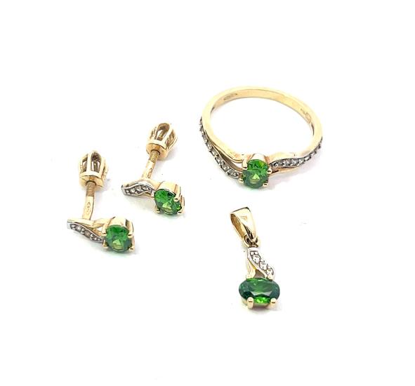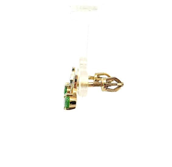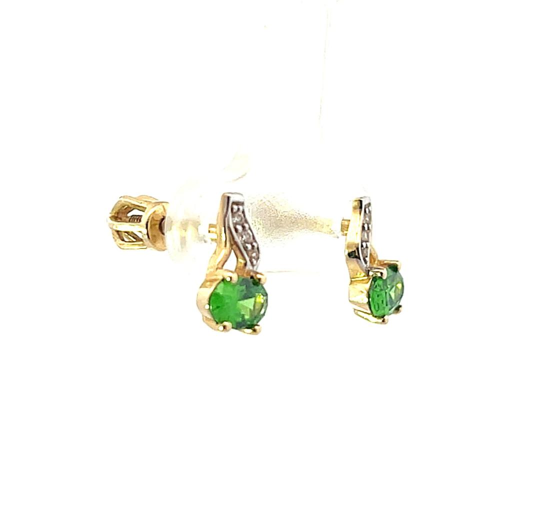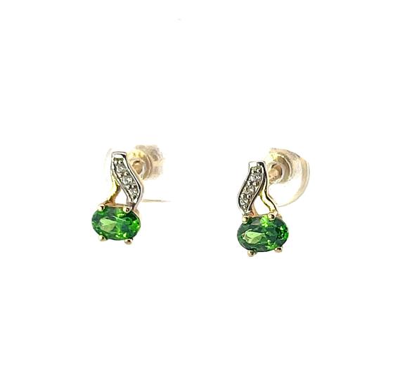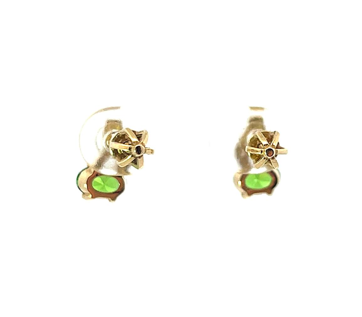Zlaté náušnice o ryzosti 585/1000, punc labuť. Váha 2,17 g, výška 11 mm, v nejširším bodě 6 mm. Kameny jsou syntetické.