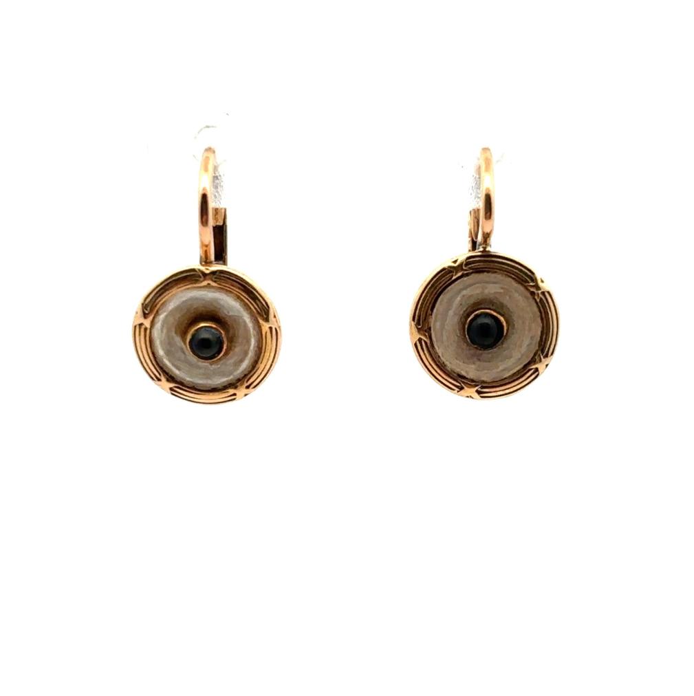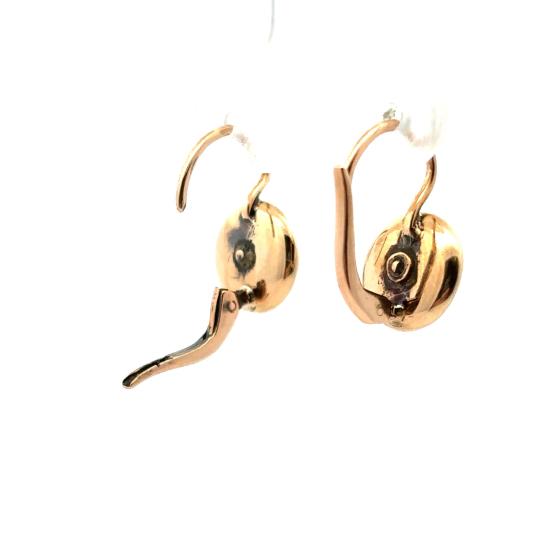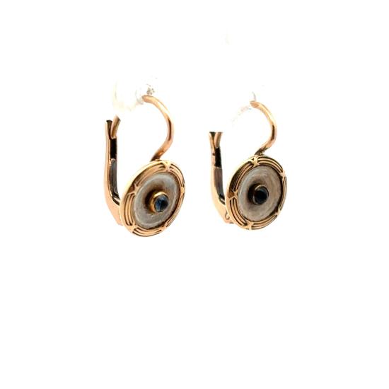 Náušnice z kombinace žlutého a růžového zlata o ryzosti 585/1000, punc labuť. Váha 2,19 g, výška 15,5 mm, průměr 9 mm. Kameny jsou syntetické.