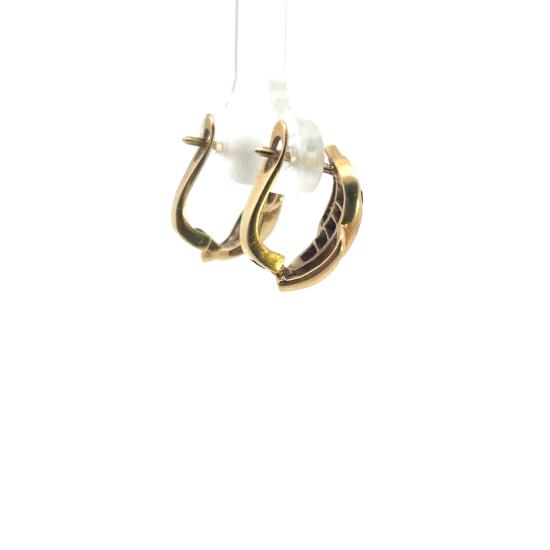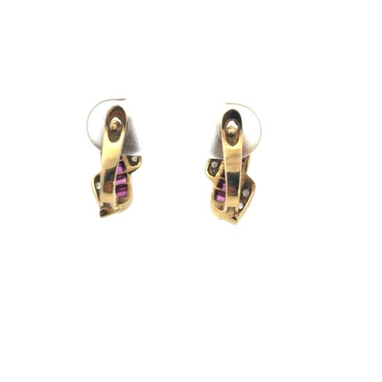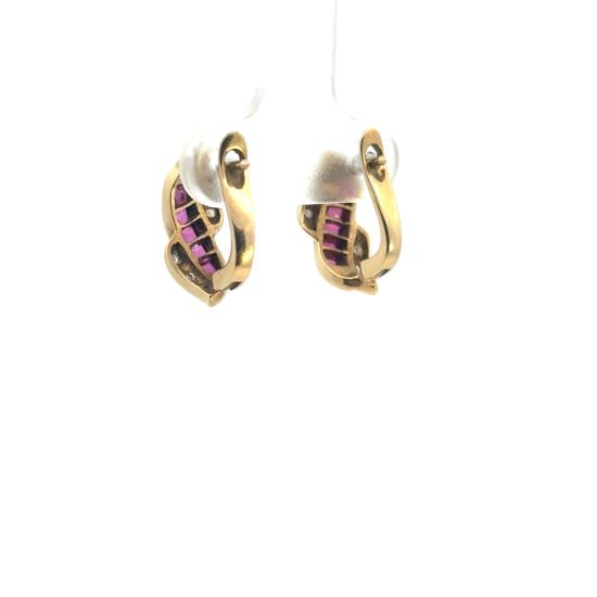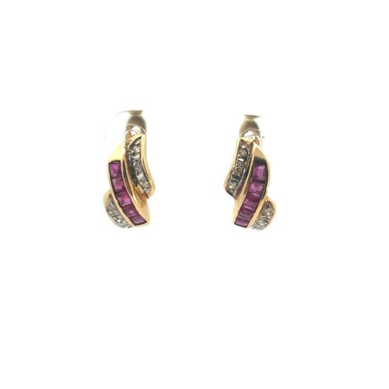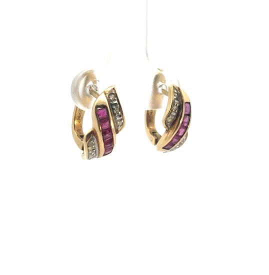 Zlaté náušnice o ryzosti 585/1000, punc labuť. Váha 3,58 g, výška 16 mm, v nejširším bodě 7,5 mm. Kámen - syntetický rubín - 10 ks. Kámen - přírodní diamant briliantového brusu - 12 ks. Celkem cca 0,16 ct.