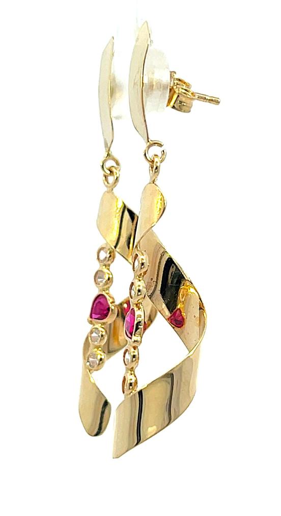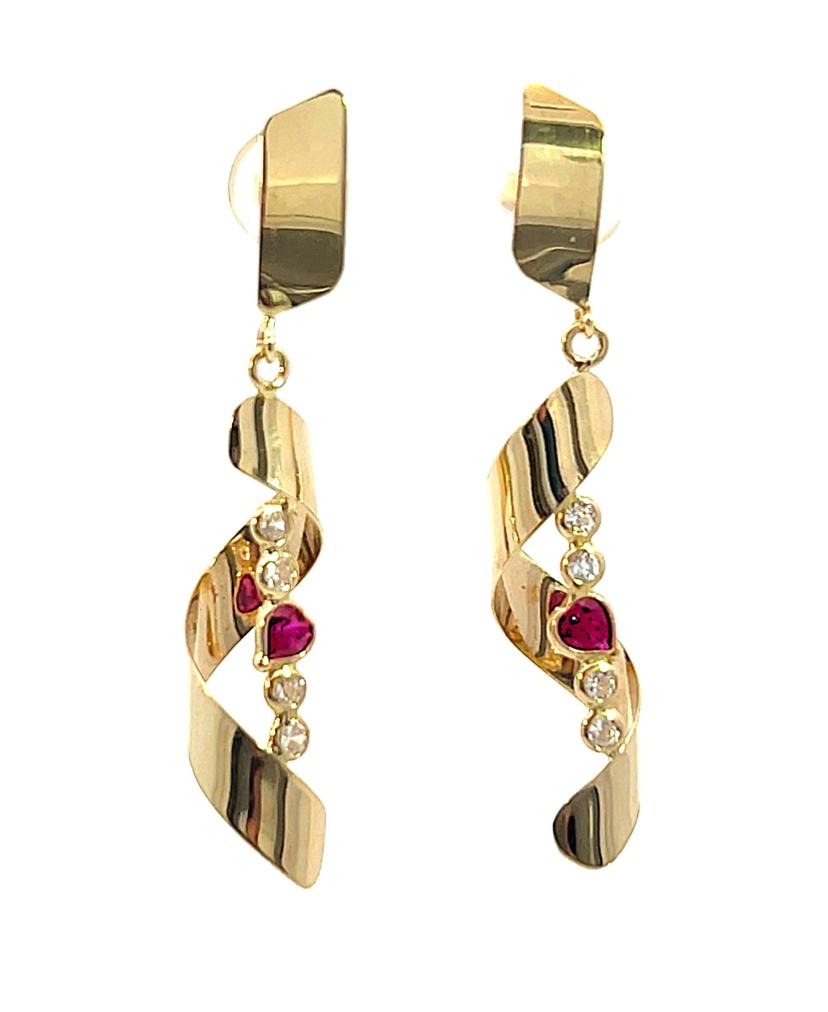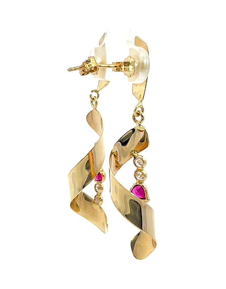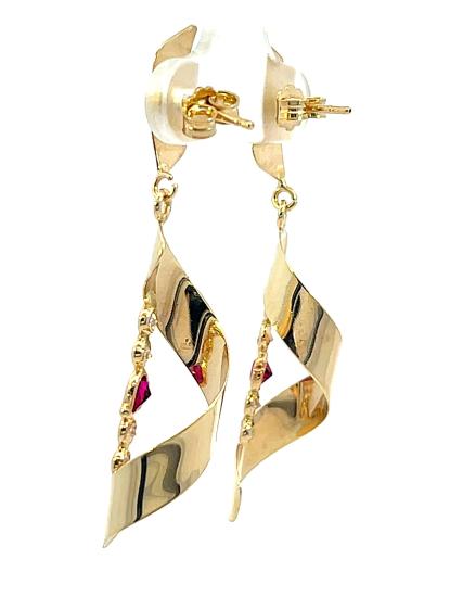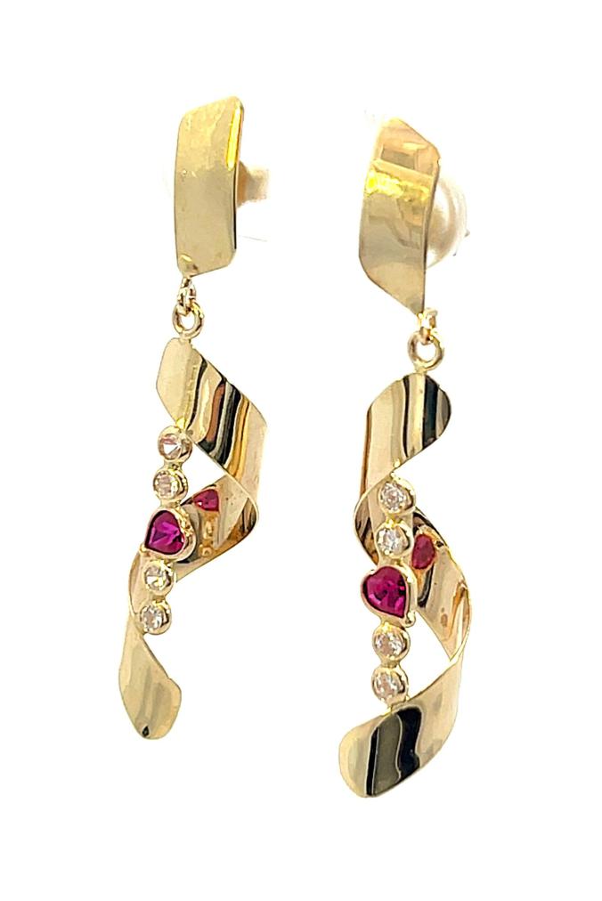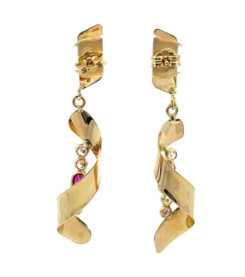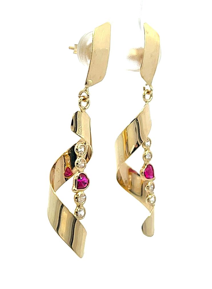 Zlaté náušnice o ryzosti 585/1000, punc labuť. Váha 3,70 g, výška 50 mm, v nejširším bodě 9 mm. Kameny jsou syntetické.