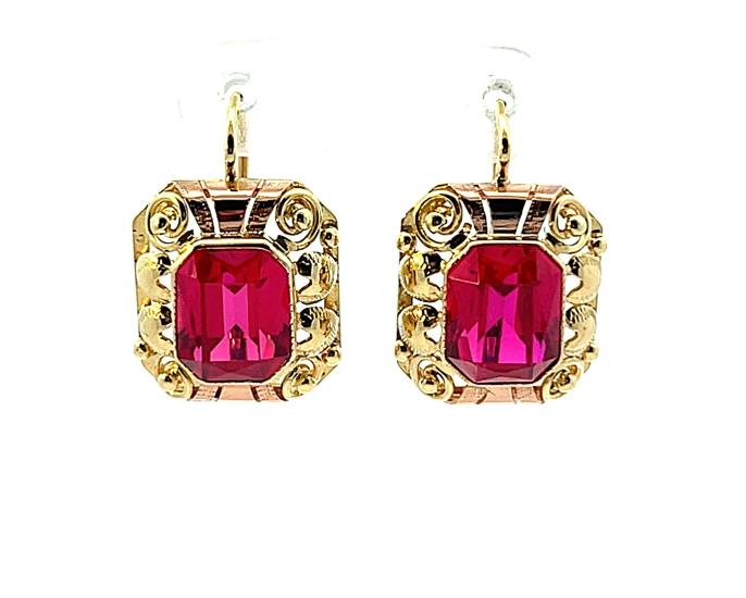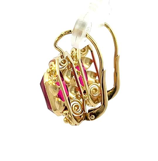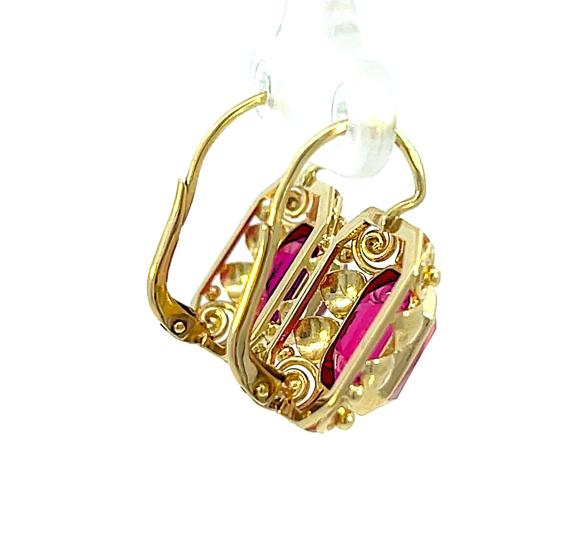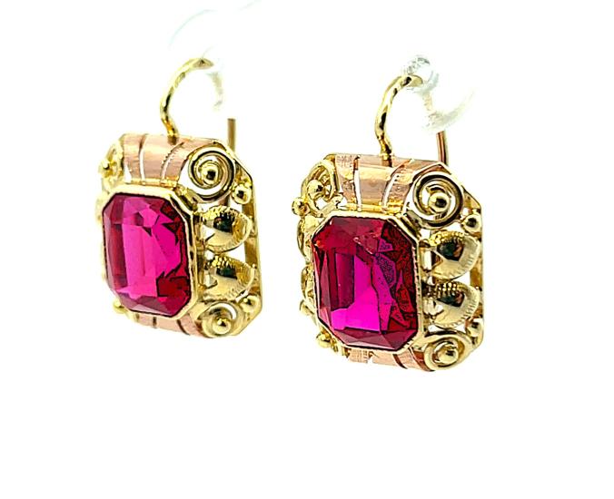 Náušnice z kombinace žlutého a růžového zlata o ryzosti 585/1000, punc čejka. Váha 4,76 g, výška 19,5 mm, v nejširším bodě 13 mm. Kameny jsou syntetické.
