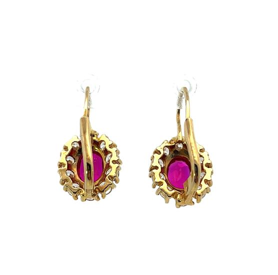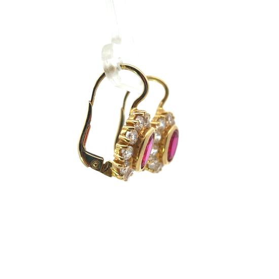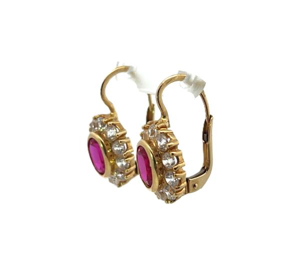Zlaté náušnice o ryzosti 585/1000, punc labuť. Váha 5,03 g, výška 21 mm, v nejširším bodě 12 mm. Kameny jsou syntetické.