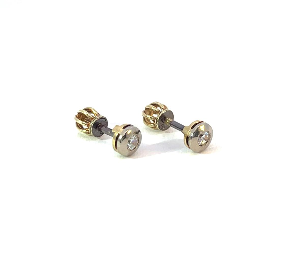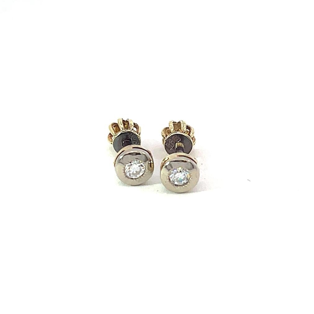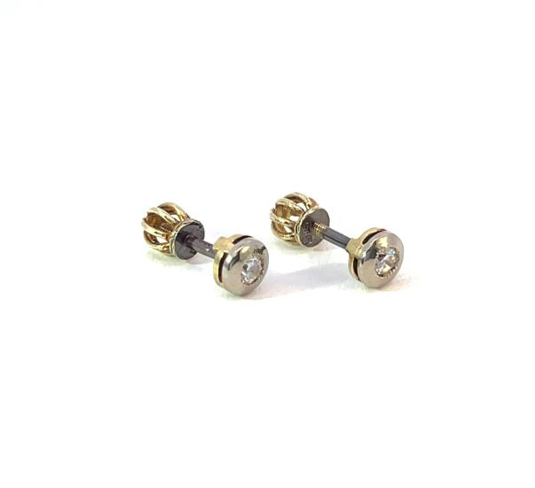 Náušnice z kombinace žlutého a bílého zlata o ryzosti 585/1000, punc čejka. Váha 1,57 g, průměr ozdoby 5 mm.