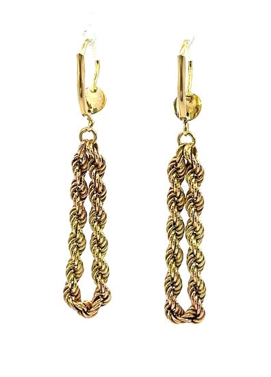 Náušnice z kombinace žlutého a růžového zlata o ryzosti 585/1000, punc labuť. Váha 3,79 g, výška 50 mm, v nejširším bodě 9 mm.