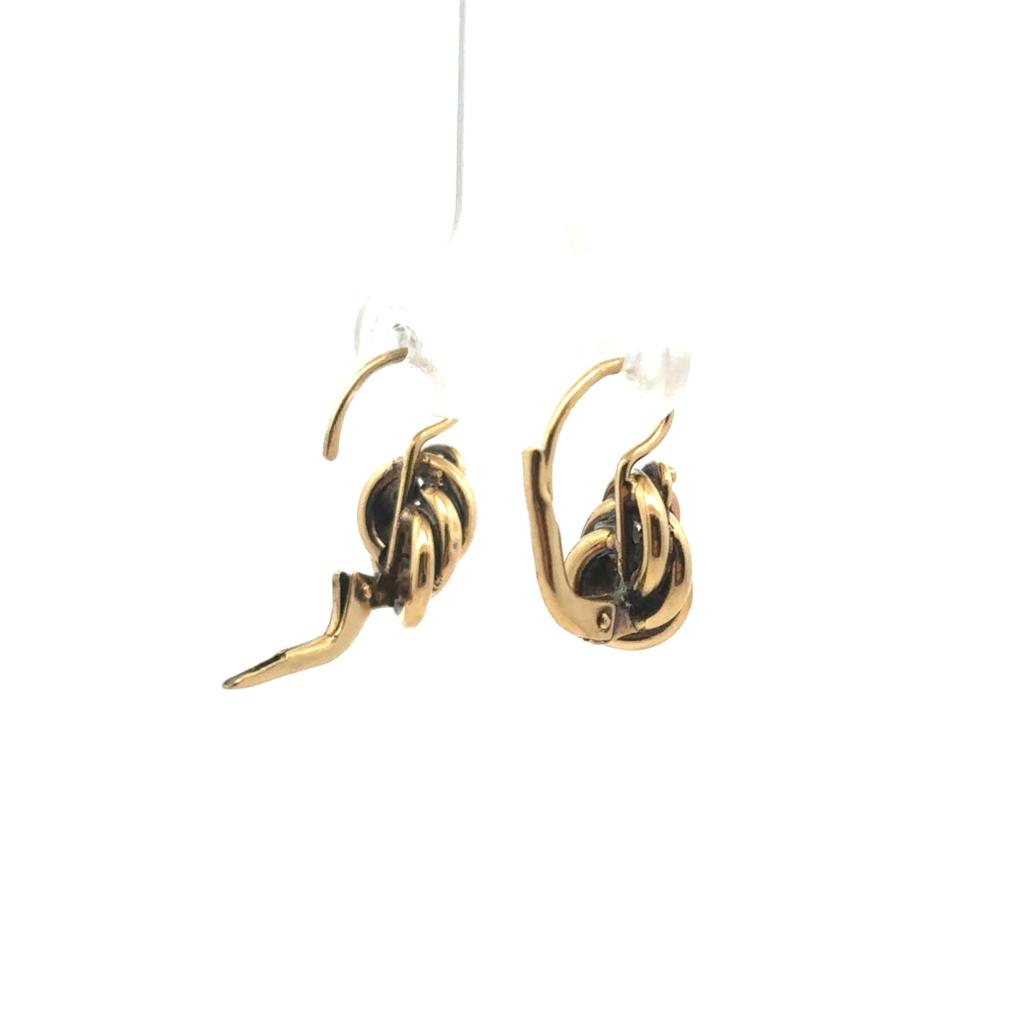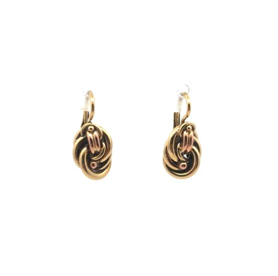 Náušnice z kombinace žlutého a růžového zlata o ryzosti 585/1000, punc lvíček (1 z náušnic dopuncována - punc labuť). Váha 1,98 g, výška 16 mm, v nejširším bodě 7 mm.