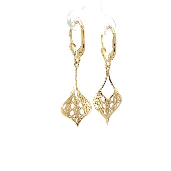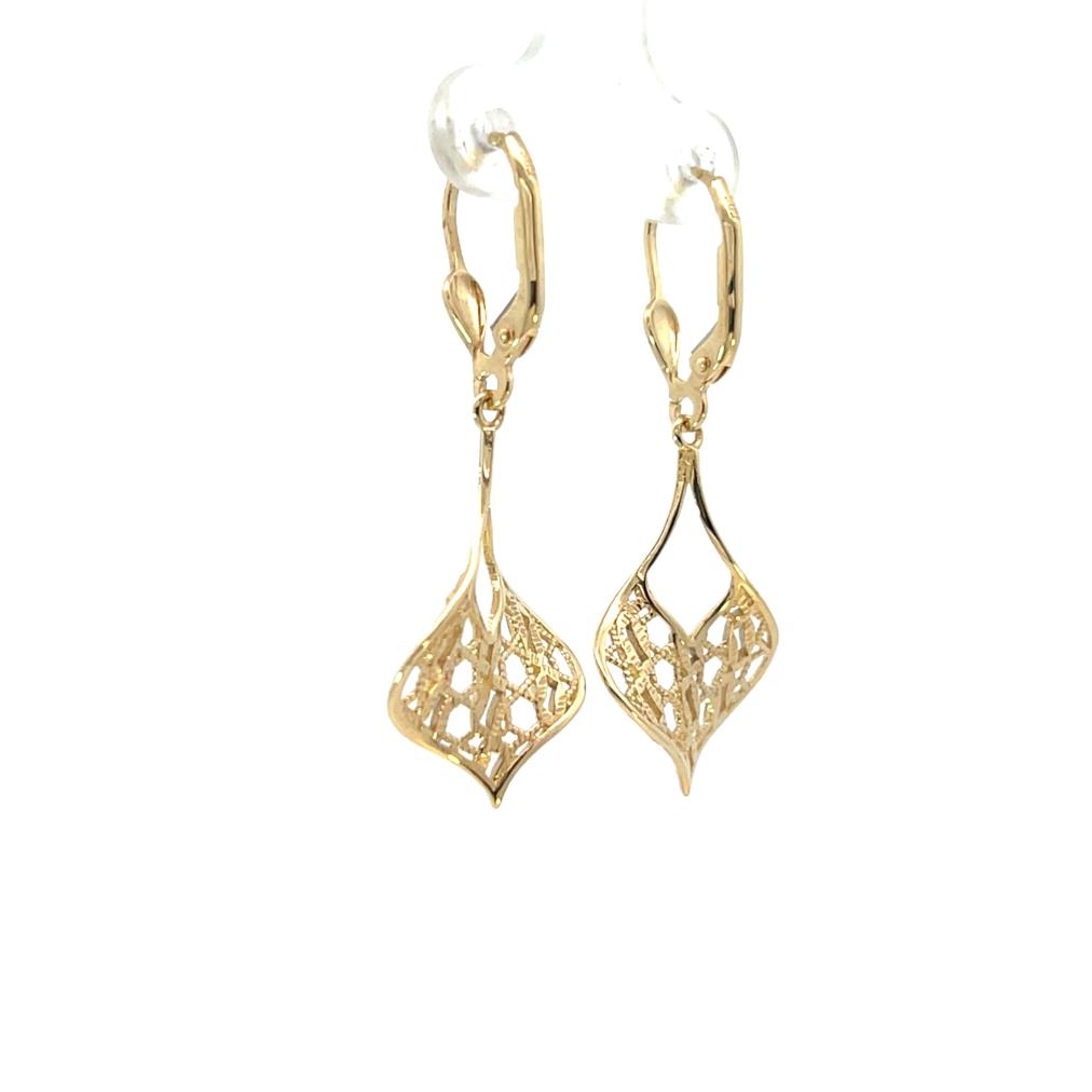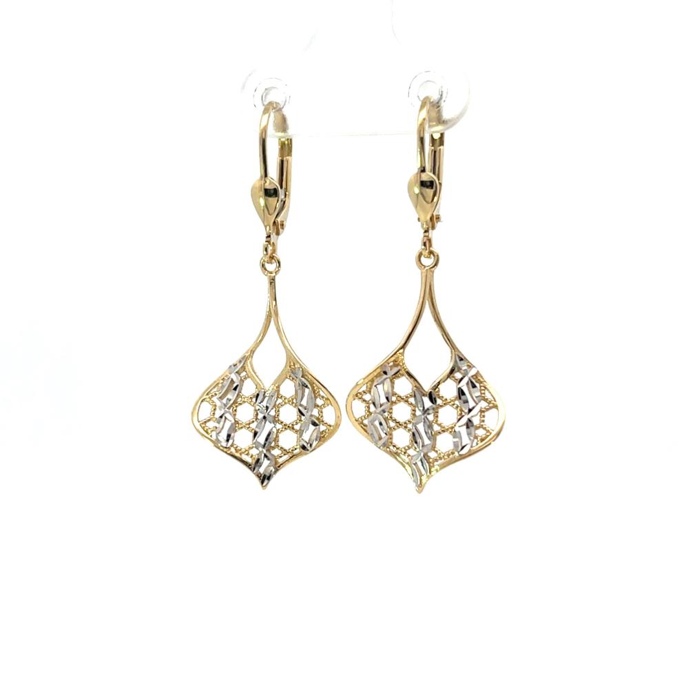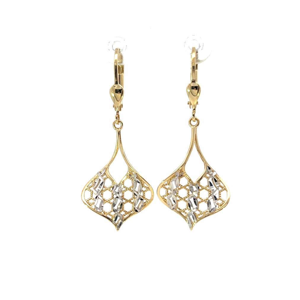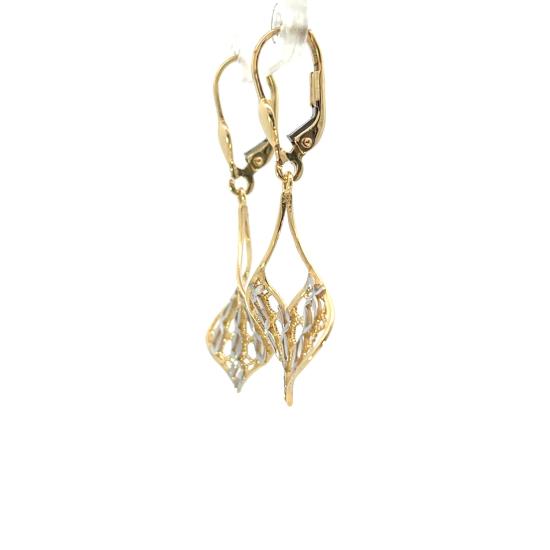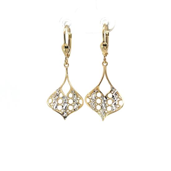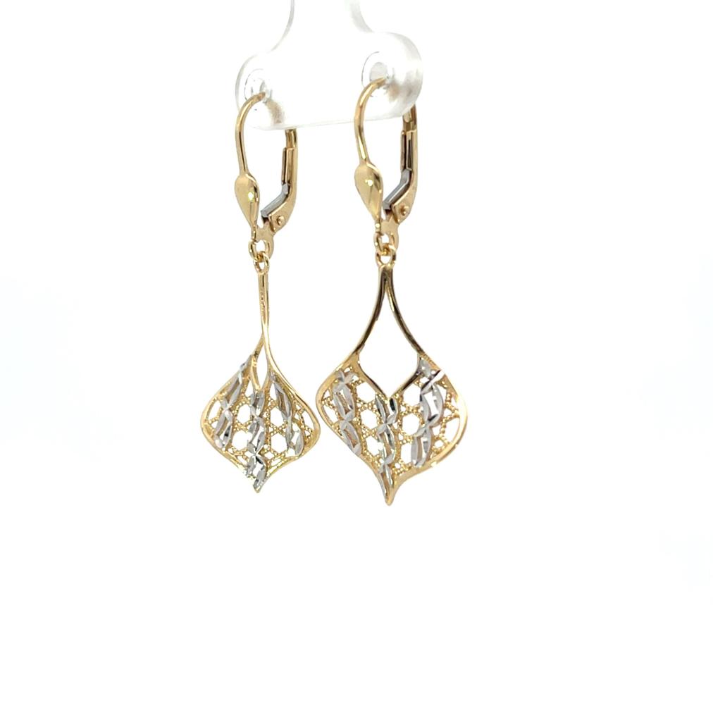 Náušnice z kombinace žlutého a bílého zlata o ryzosti 585/1000, platný polský punc. Váha 2,85 g, výška 41 mm, v nejširším bodě 16 mm.