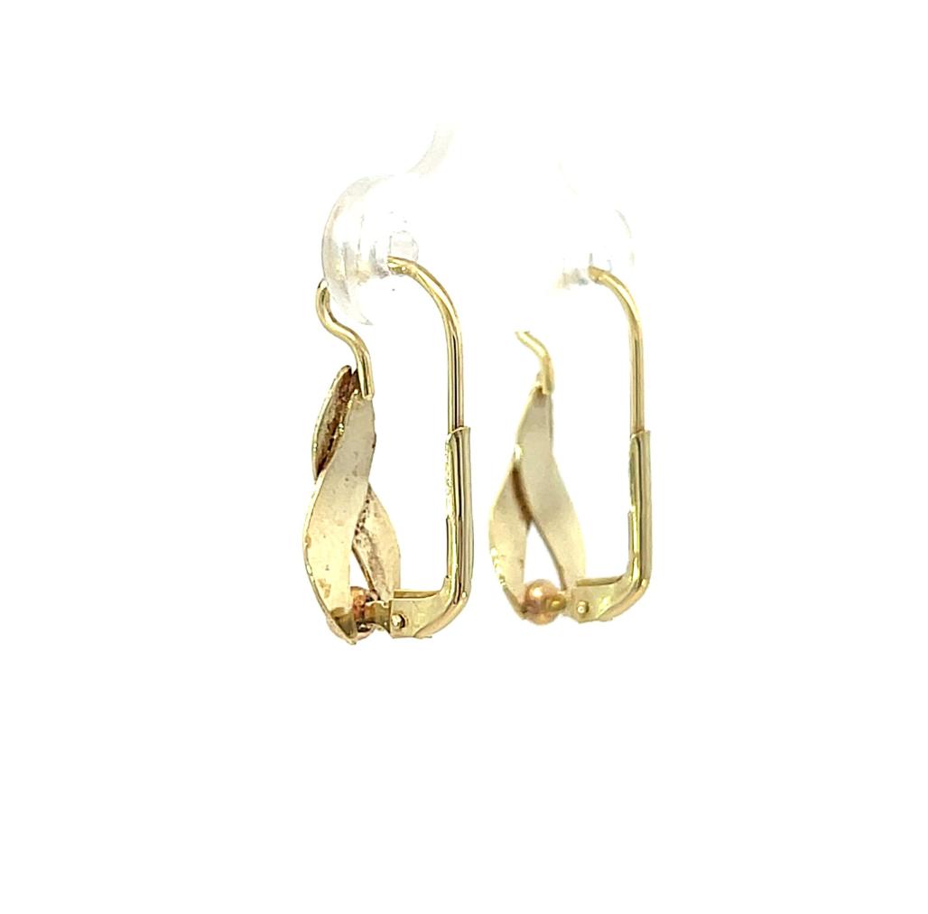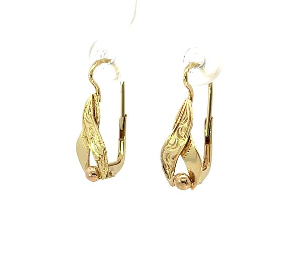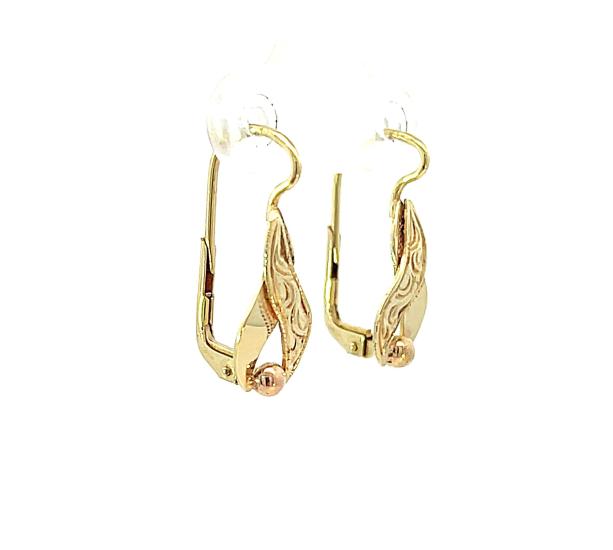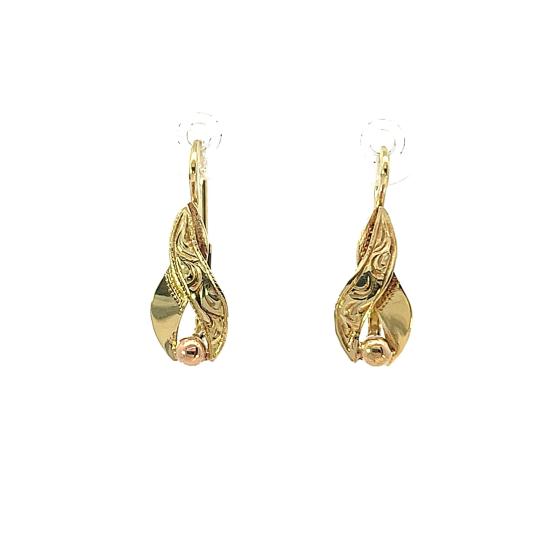 Náušnice z kombinace žlutého a růžového zlata o ryzosti 585/1000, punc labuť. Váha 2,16 g, výška 20,5 mm, v nejširším bodě 7 mm.