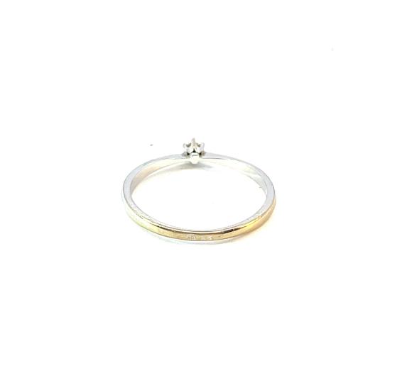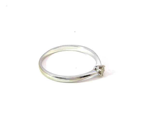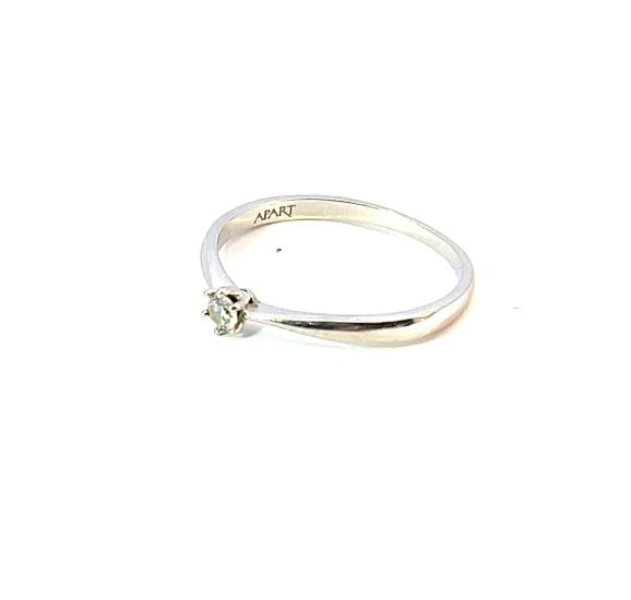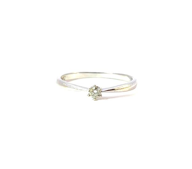 Prsten z bílého zlata o ryzosti 585/1000, platný polský punc. Velikost 56, váha 1,48 g, v nejširším bodě 4 mm. Kámen - přírodní diamant briliantového brusu - 1 ks, cca 0,07 ct.