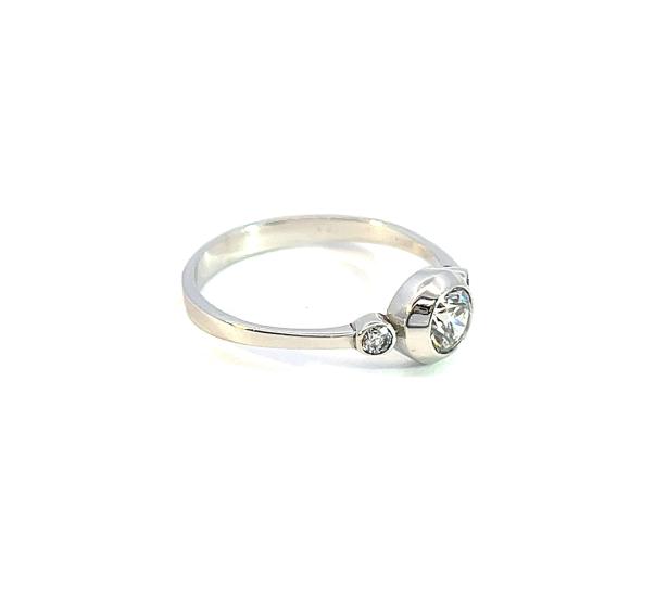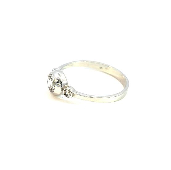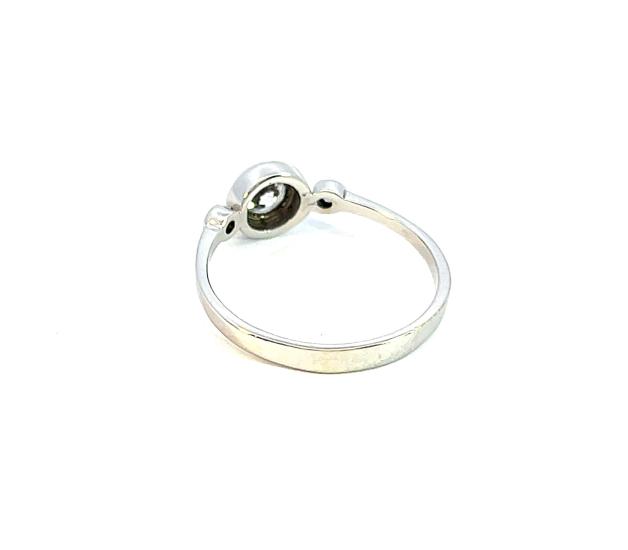 Prsten z bílého zlata o ryzosti 585/1000, punc labuť. Velikost 57, váha 2,36 g, v nejširším bodě 7 mm.