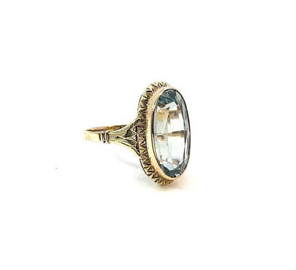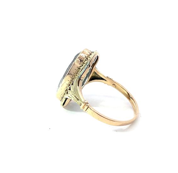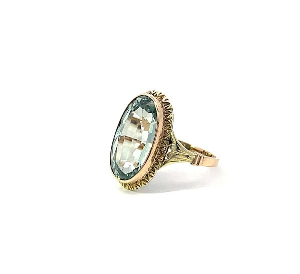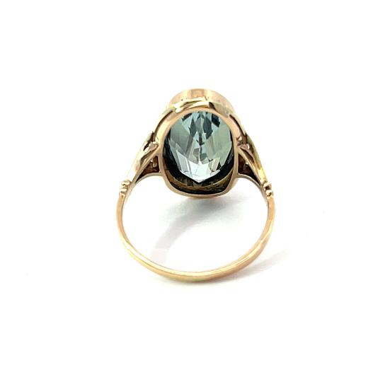 Prsten z kombinace žlutého a růžového zlata o ryzosti 585/1000, punc lvíček. Velikost 53, váha 4,01 g, rozměr hlvy prstenu 19 x 15 mm. Kámen je syntetický.