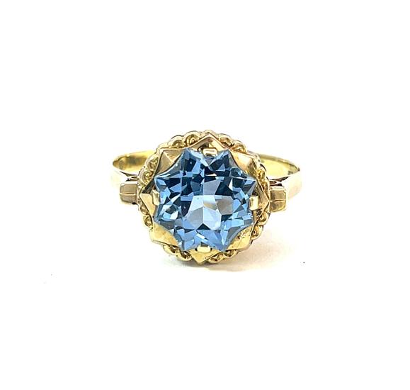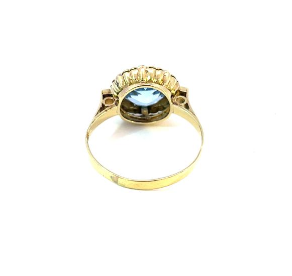 Zlatý prsten o ryzosti 585/1000, punc lvíček. Velikost 54, váha 3,0 g, průměr ozdoby 13 mm. Kámen je syntetický.