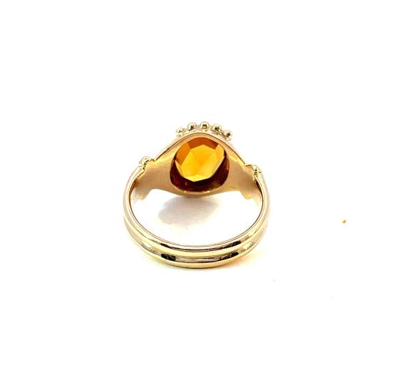 Prsten z růžového zlata o ryzosti 580/1000, punc liška. Velikost 53, váha 5,18 g, rozměr hlavy prstenu 13 x 17 mm. Kámen je syntetický. Zlato má po okraji kamene velmi drobné tečkovité prohlubně - nejspíš se jedná o stopy po upevnění kamene ve šperku.