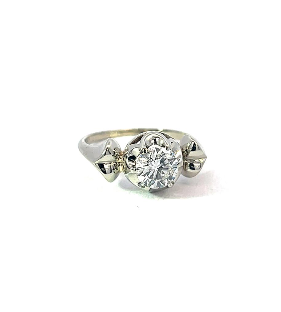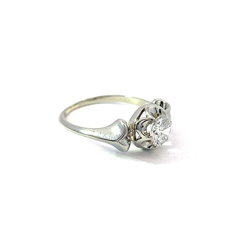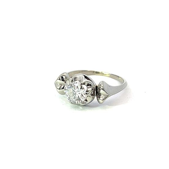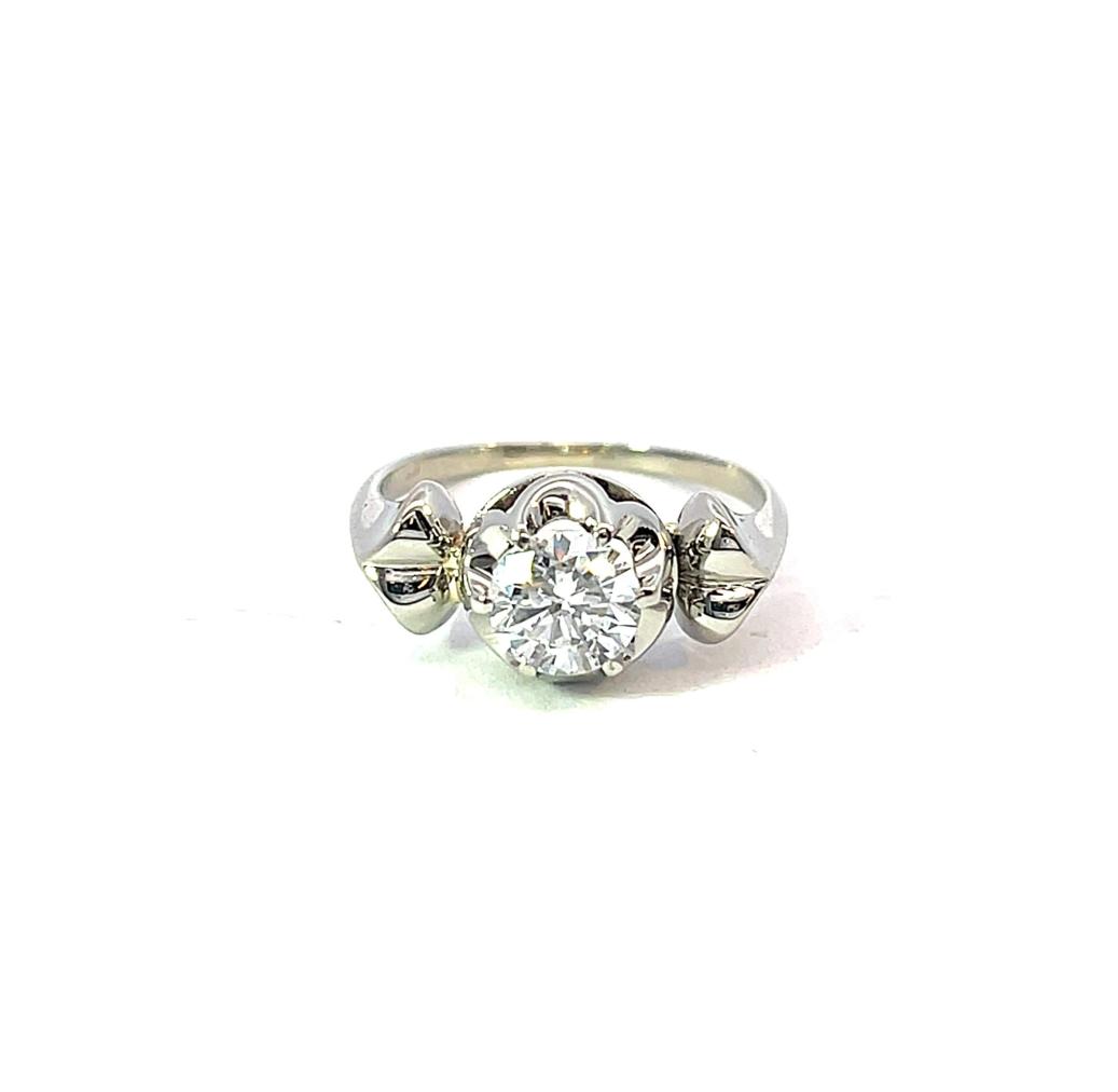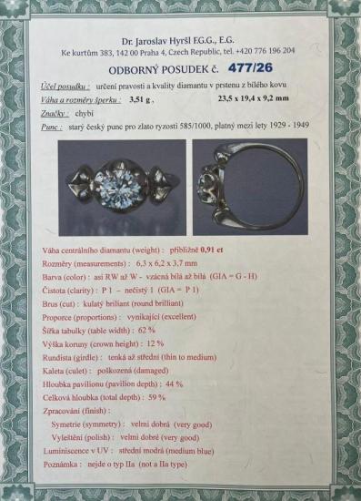 Prsten z bílého zlata o ryzosti 585/1000, punc lvíček. Váha 3,51 g, velikost 53, v nejširším bodě 9 mm. Kámen - přírodní diamant briliantového brusu - 1 ks, barva: RW až W, čistota: P 1, cca 0,91 ct. Kámen lehce kloktá.