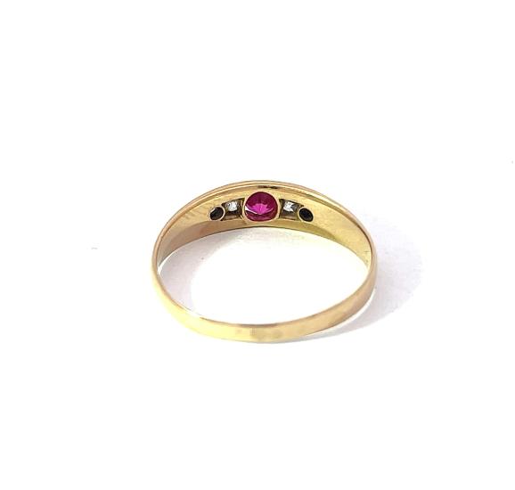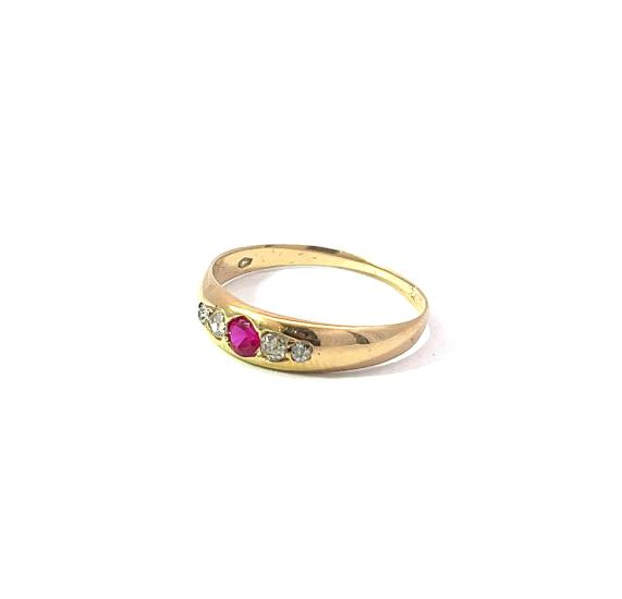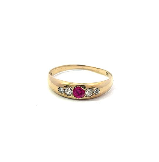 Starožitný zlatý prsten o ryzosti 580/1000 s rakousko-uherským puncem - liška. Prsten je zdoben čtyřmi diamanty a rubínem. Váha 1,84 g, velikost 56. V nejširším bodě měří 5 mm v nejužším 2 mm. Průměr rubínu je 3 mm. Dva větší diamanty maji každý cca 0,05 ct a dva menší mají každý cca 0,02 ct. Dohromady mají diamanty cca 0,14 ct.