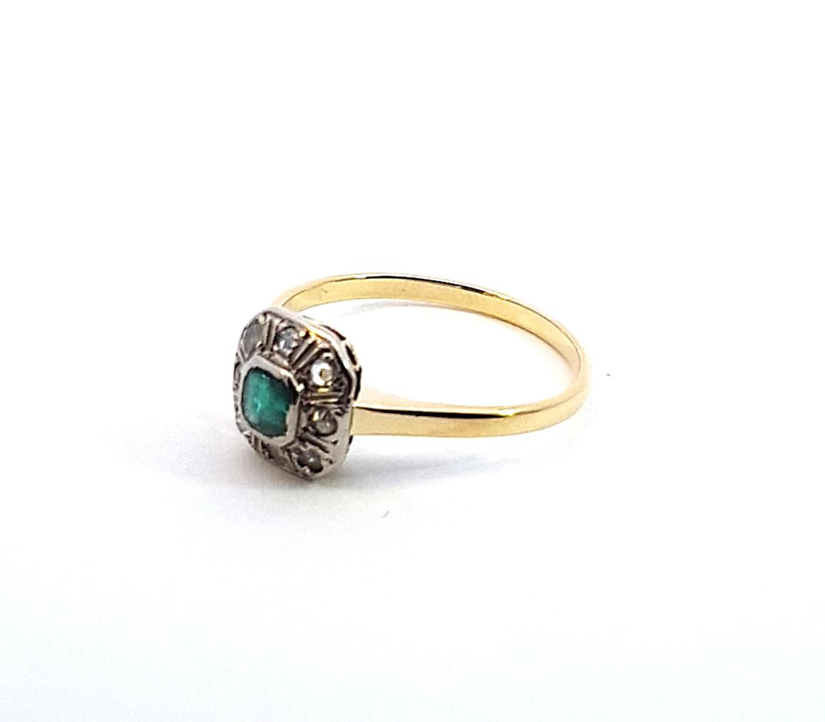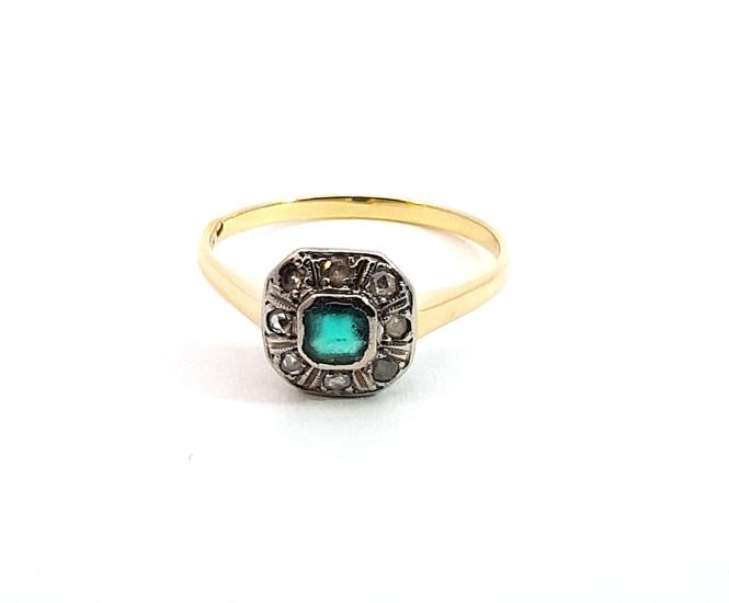 Prsten z kombinace žlutého a bílého zlata o ryzosti 585/1000, punc lvíček. Velikost 58, váha 2,61 g, rozměr hlavy prstenu 9,5 x 9,5 mm. Kámen - smaragd - 1 ks. Kámen - přírodní diamant routa - 5 ks. Tři kameny byly nahrazeny zirkonem. Smaragd je na povrchu opotřebený požíváním, jeho povrch je matný.