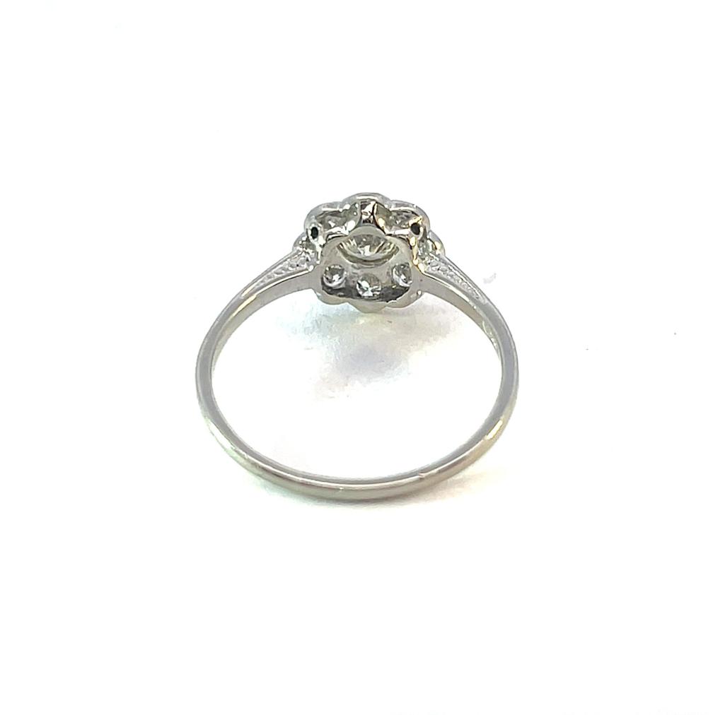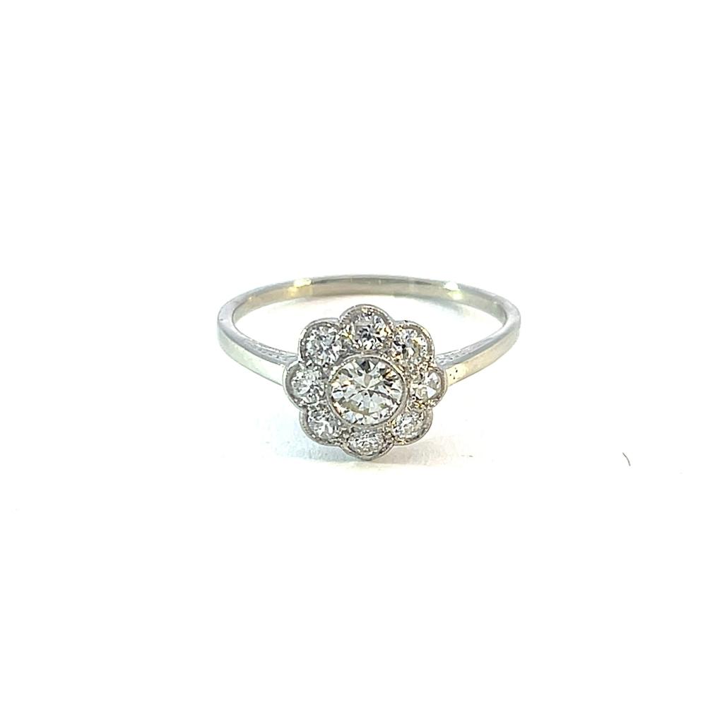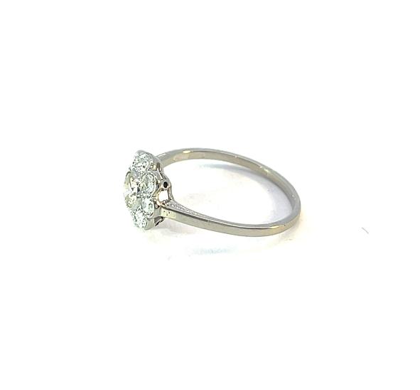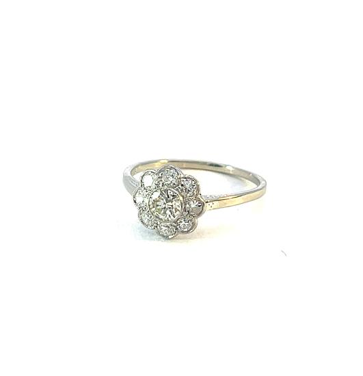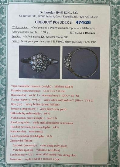 Prsten z bílého zlata o ryzosti 585/1000, punc lvíček. Váha 1,99 g, velikost 57, průměr ozdobné části 10,5 mm. Kámen - přírodní diamant briliantového brusu - centrální kámen: 1 ks, cca 0,32 ct, barva: TC 1, čistota: VVS 2, ostatní kameny - přírodní diamant briliantového starého brusu - 8 ks, cca 0,045 ct každý - dohromady cca 0,68 ct.