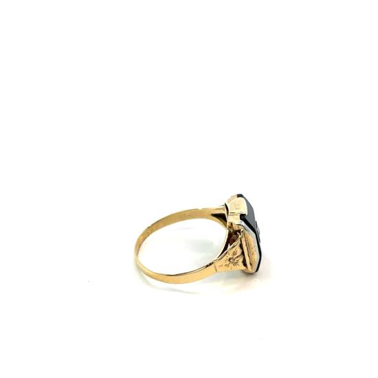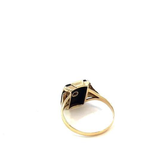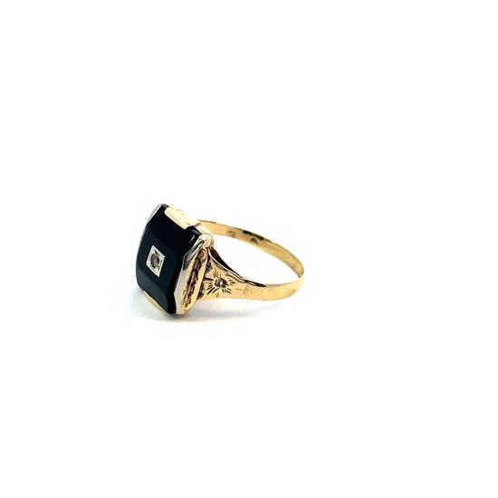 Prsten z kombinace žlutého, růžového a bílého zlata o ryzosti 585/1000, punc lvíček. Velikost 54, váha 2,92 g, hlava prstenu 12 x 12 mm. Onyx nese známky opotřebení.