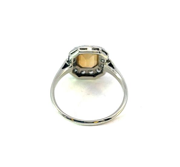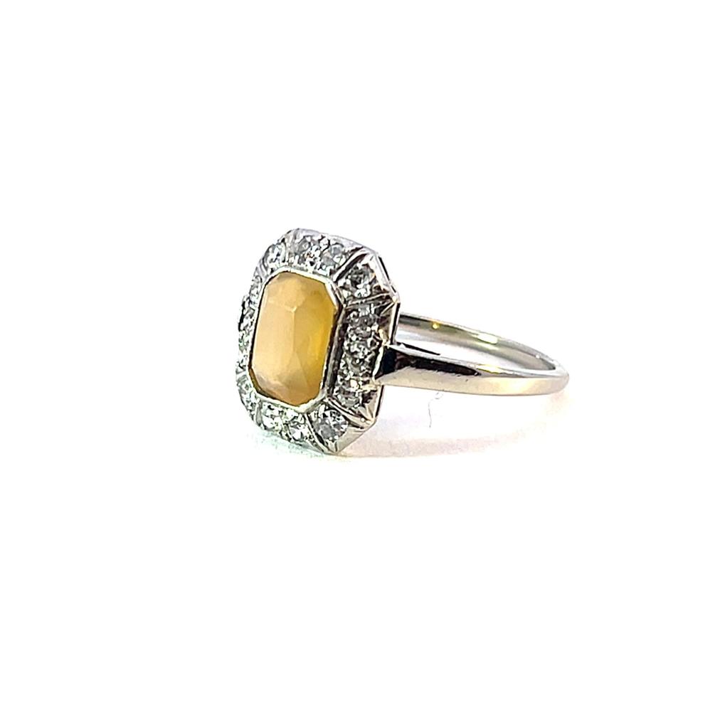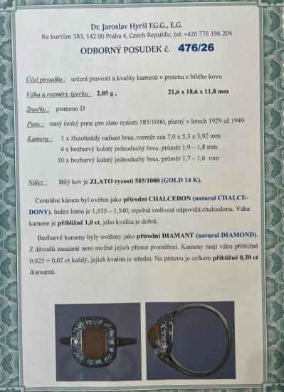 Prsten z bílého zlata o ryzosti 585/1000, punc lvíček. Váha 2,05 g, velikost 51, rozměr hlavy prstenu 12 x 10 mm. Kámen - přírodní chalcedon, brus radiant - 1 ks, cca 1,0 ct. Kámen - přírodní diamant briliantového brusu - 14 ks, větší kameny: 4 ks, cca 0,025 ct každý, ostatní kameny: 10 ks, cca 0,02 každý - dohromady cca 0,30 ct.